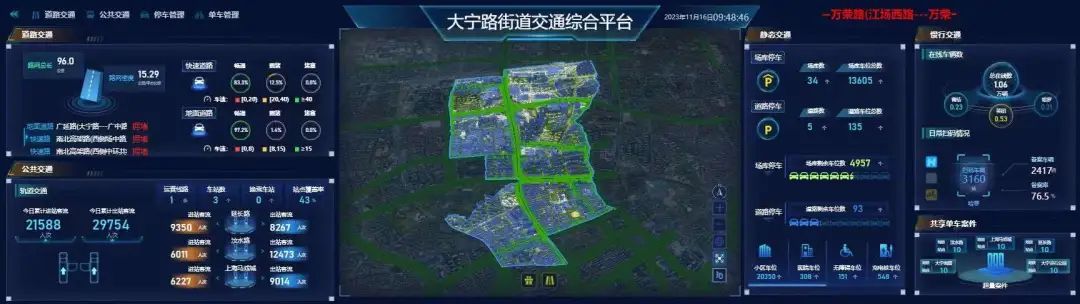 在区城运中心、建设管理委等部门的支持下,大宁路街道打造了街道层面的交通运行智能管理平台,实现数据共享、实时监测、动态预警的功能,包含“单车管理”“应急响应”“轨交客流”“现场监管”“机动车停车管理”等多个模块。