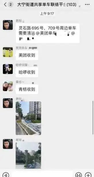 线上管理,建立“大宁街道共享单车联络平台”微信群,形成“发现—上报—处理”闭环。由专人巡查全辖区范围内停放的共享单车,发现问题及时上报,各单车运营商负责人第一时间调度清理,严格落实网格化管理职责。