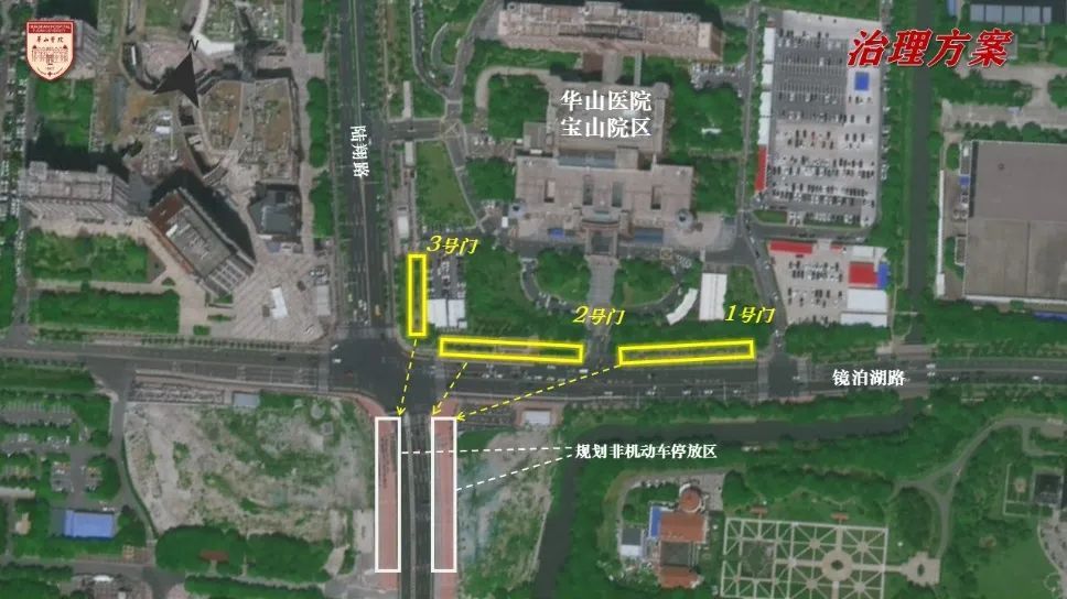即:清除1、2、3号门口所有违规停放的非机动车,设置专用停车位(除3号门口保留部分停车区域外,其他都移至镜泊湖路以南,陆翔路东西两侧停放),区交警支队每日动态监管。