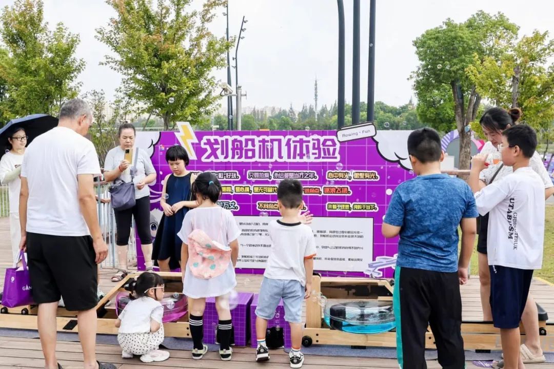 在观赛体验上,奉贤还结合大赛的举办,首次设立了“艇有意思”水上文化嘉年华,把国际潮流水上运动和地方美食、特产、人文相结合,打造了“艇”好玩、“艇”好听、“艇”好看、“艇”好奇四个主题的10多个体验场景,市民游客在观看精彩比赛之余,可以沉浸式感受赛艇带来的独特魅力。在“艇”好玩区,市民朋友就可以体验漆艇制作,亲手打造一艘属于自己的彩绘赛艇。而在“艇”好玩区,市民朋友不仅能了解到不少体育知识,还能坐上加配有泡泡机功能的划船机,学着参赛选手一样,完成一组划船机训练,为整个大赛献上缤纷的泡泡。“小孩子可以体验的项目有很多,也可以从中了解到很多赛艇有关知识,我觉得很好。”一位孩子爸爸点赞“嘉年华”。上海海国文化(集团)有限公司党委委员、副总经理陆倩倩介绍,“艇有意思”水上文化嘉年华重在亲民,活动还包括近景魔术、新型乐队展演等,“希望吸引越来越多的市民可以关注赛事、关注赛事、爱上赛艇运动。”