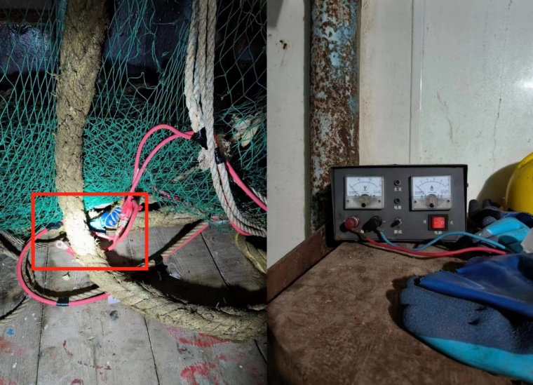 执法人员经后续依法登临检查发现,在该渔船船舱中藏有电脉冲设备,桁杆拖网中绑有电脉冲设备配套电线,疑似存在违法使用电脉冲进行电鱼作业行为。