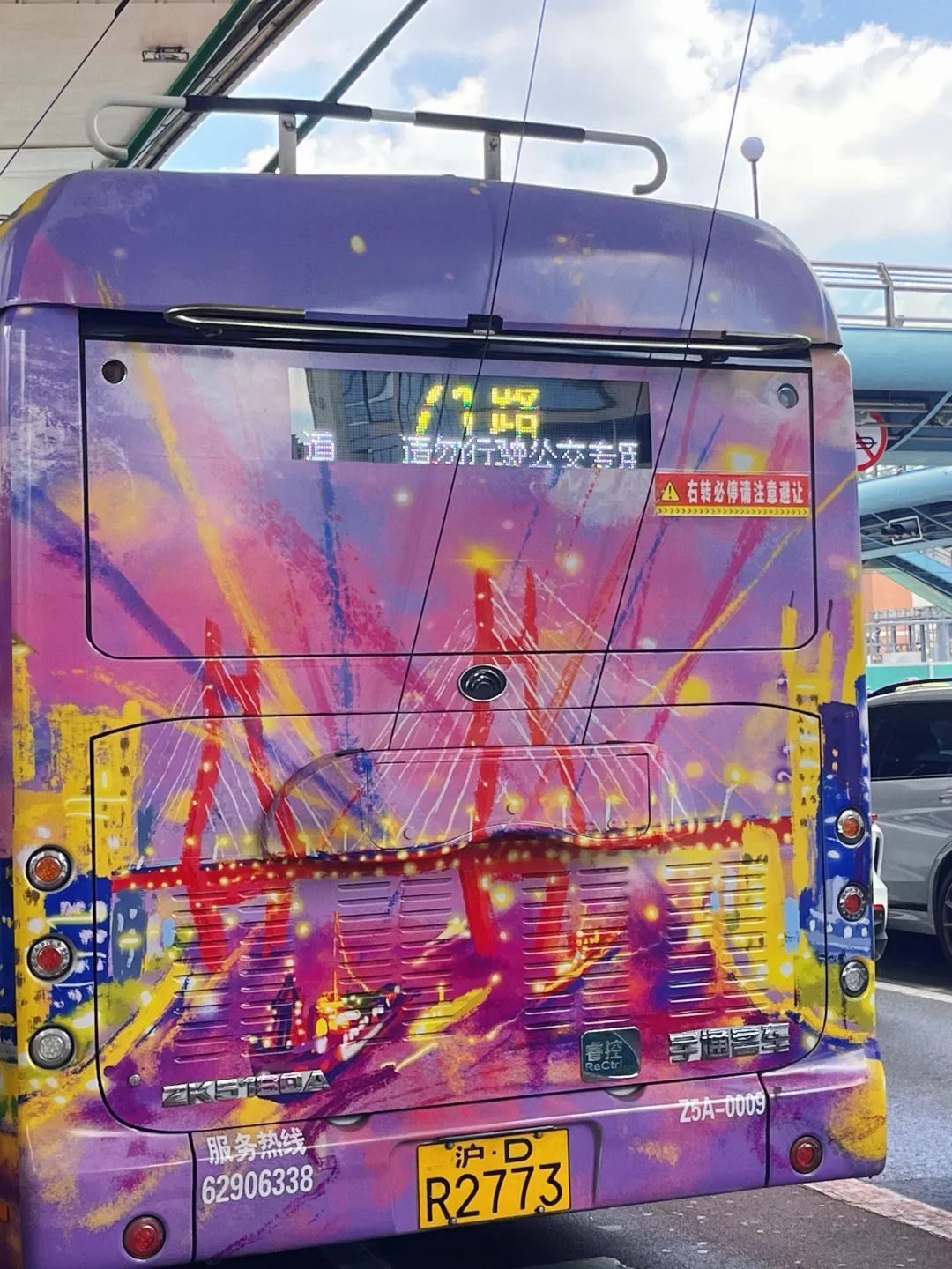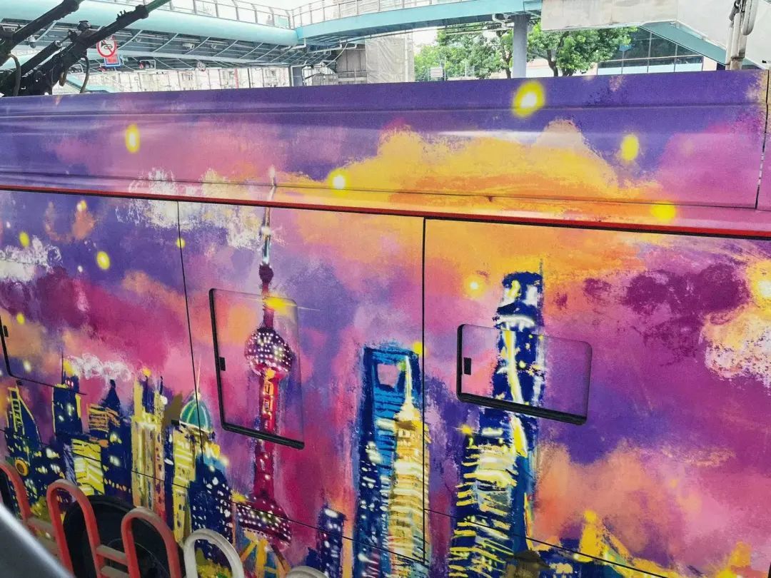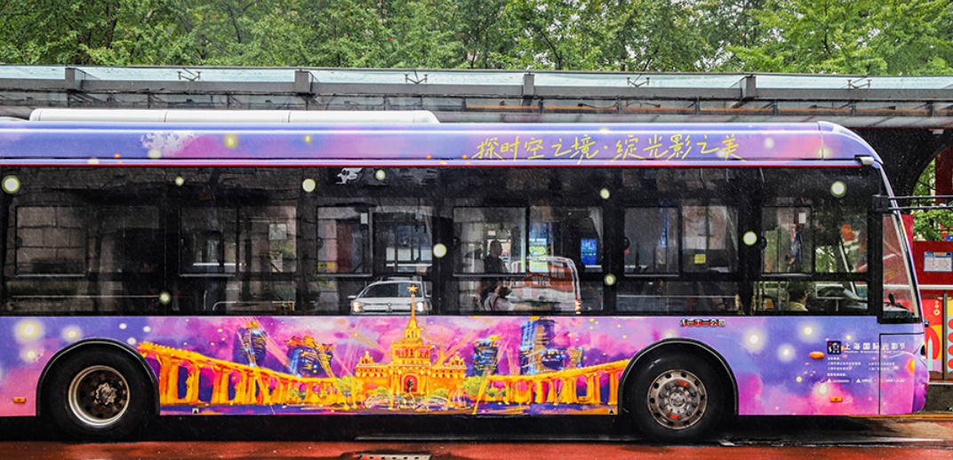 定睛一看,“巨龙”车身上所绘的彩绘正是本届上海国际光影节的系列海报。作为此次光影节的前奏,71路“上线”了两辆光影节主题彩车。浪漫的紫色主色调仿佛被光影点亮的城市夜空。