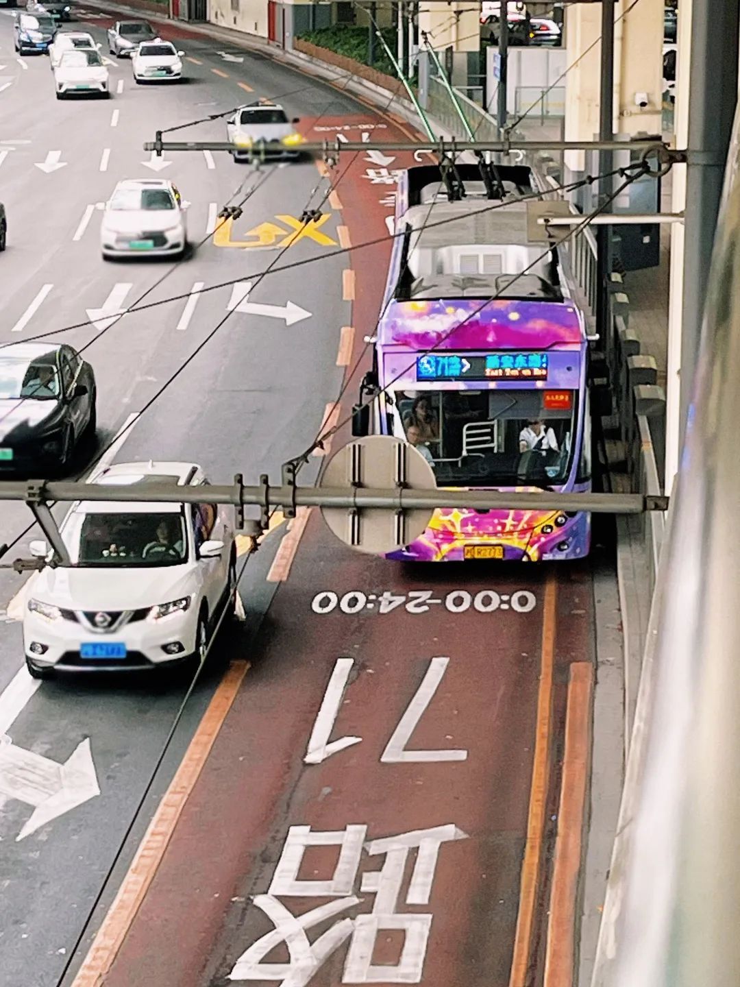 午间时分,静安寺“网红”机位华山路天桥下,一辆“高颜值”的紫色彩绘车出现在71路专用道上,瞬间吸引了天桥上不少市民的注意。