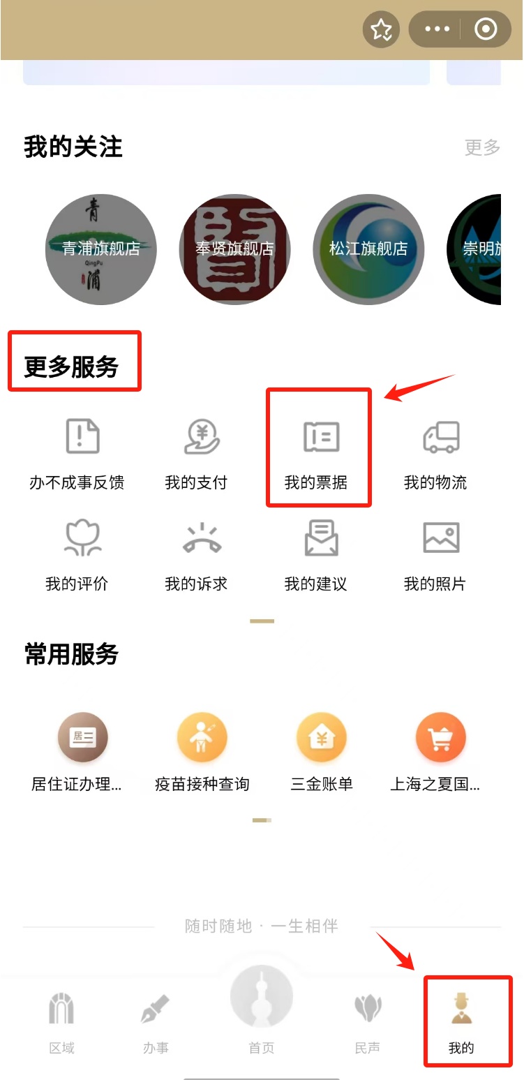 1.打开“随申办市民云”(支付宝小程序、APP、微信小程序),在下方菜单栏中选择“我的”,下滑找到“我的票据”服务,点击进入。