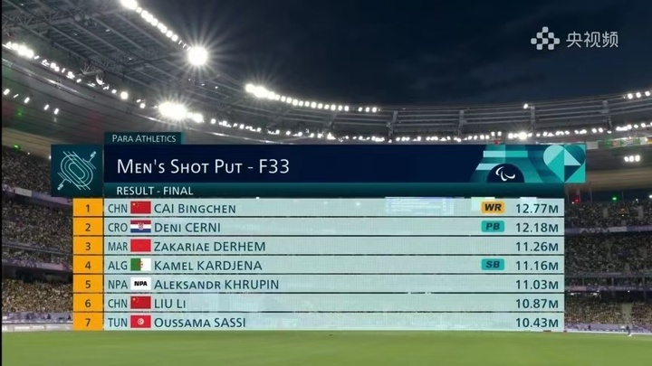 交汇点讯 北京时间9月8日,江苏小将蔡秉辰夺得巴黎残奥会男子铅球F33级金牌,并以12.77米的成绩打破世界纪录。