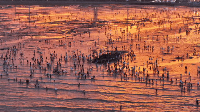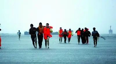 他们徒步沿滩涂走到海湾旅游区街上