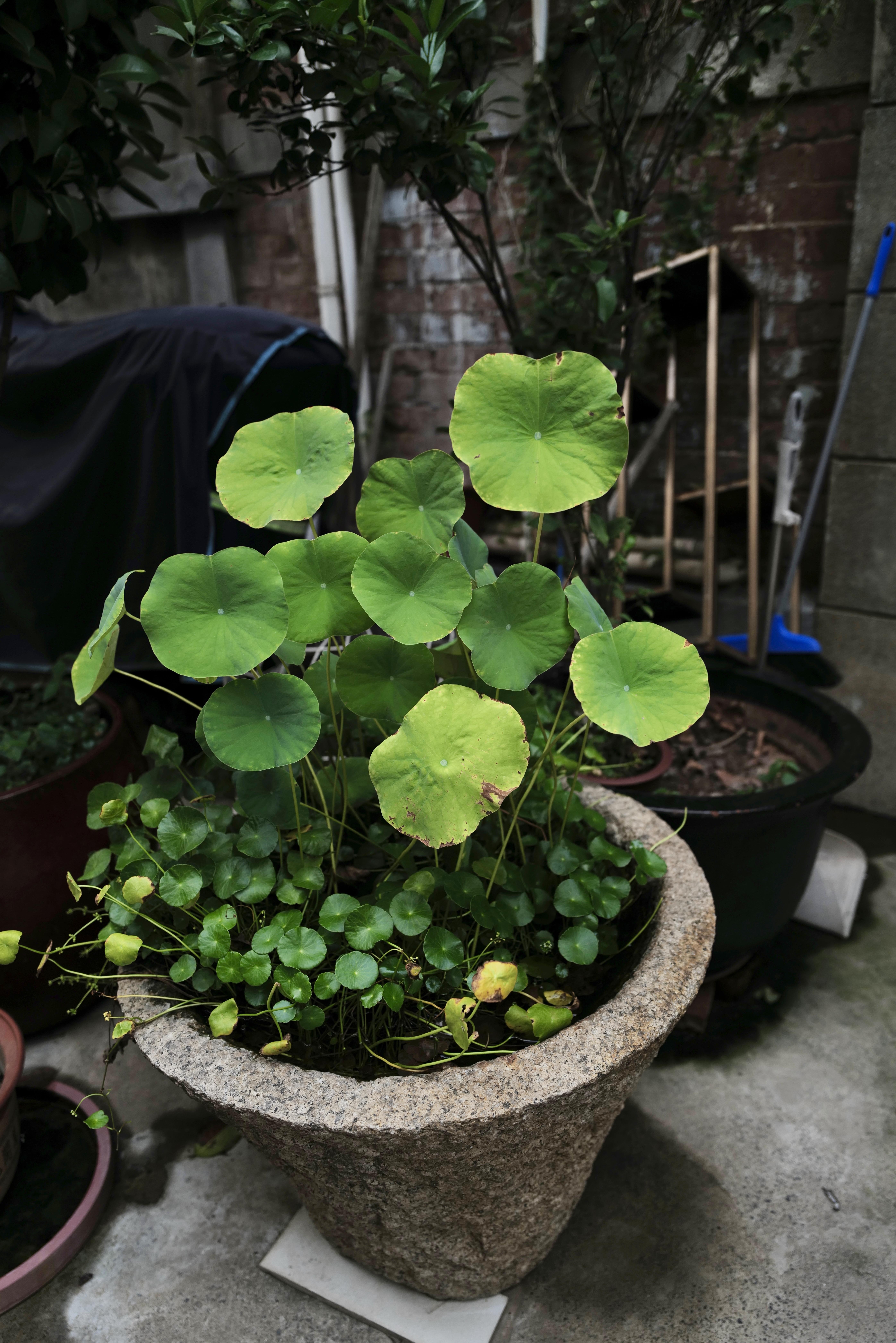 另一户人家门口巨大的老石缸里,大小铜钱草错落有致。枝繁叶茂好不热闹。