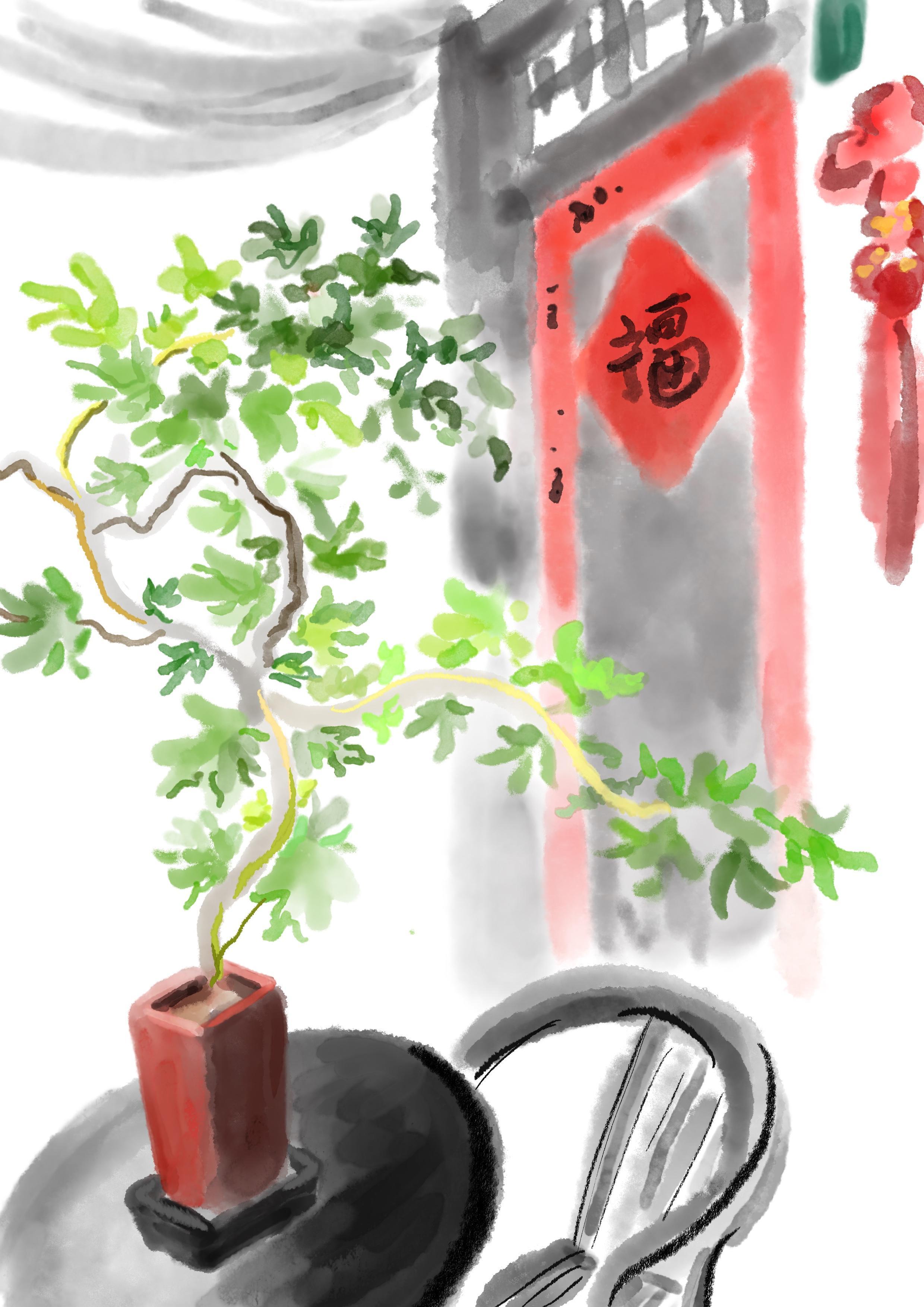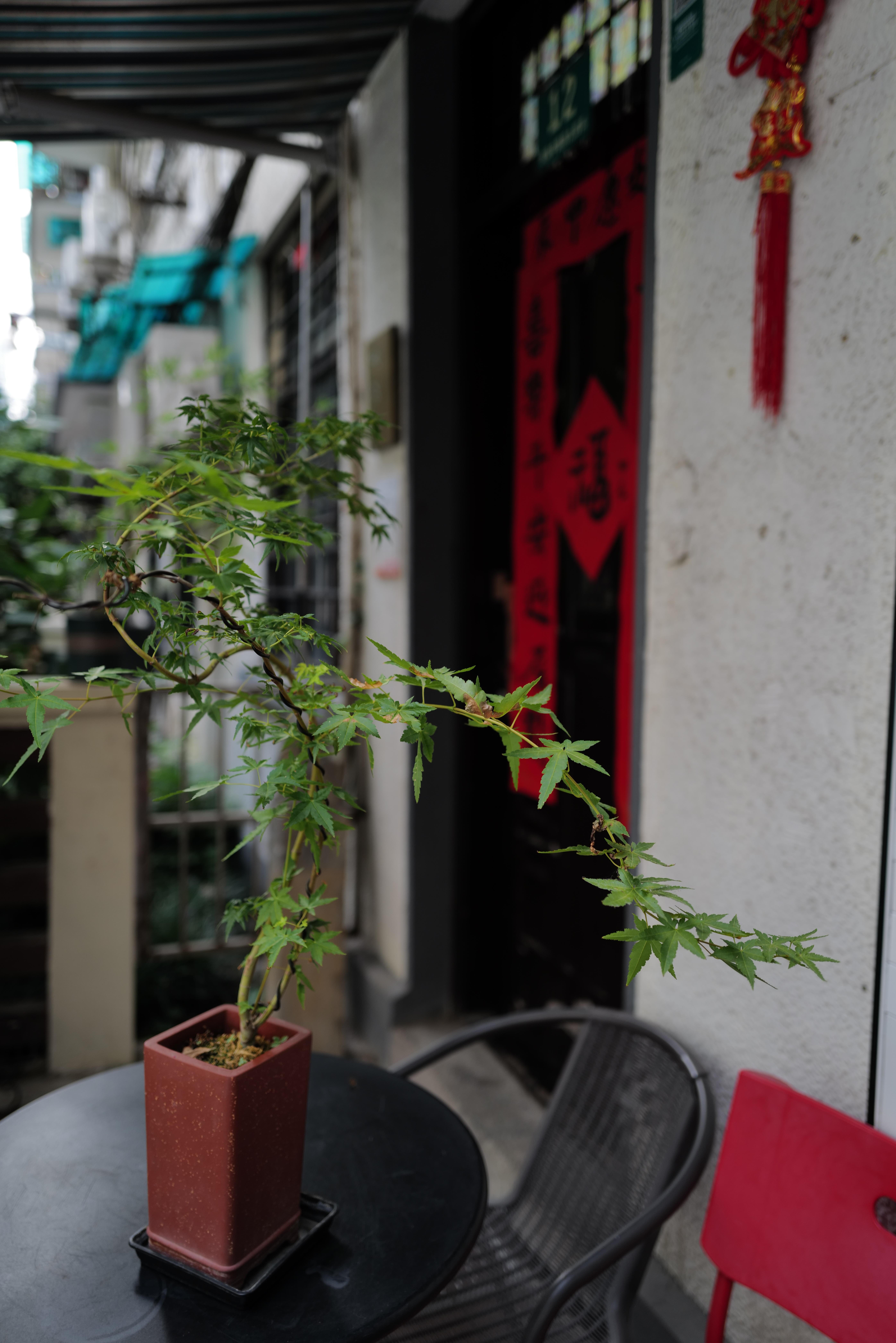 紫砂盆里被修剪得宛若游龙的枫叶盆栽,这户人家的审美情趣古朴大方令人愉悦。