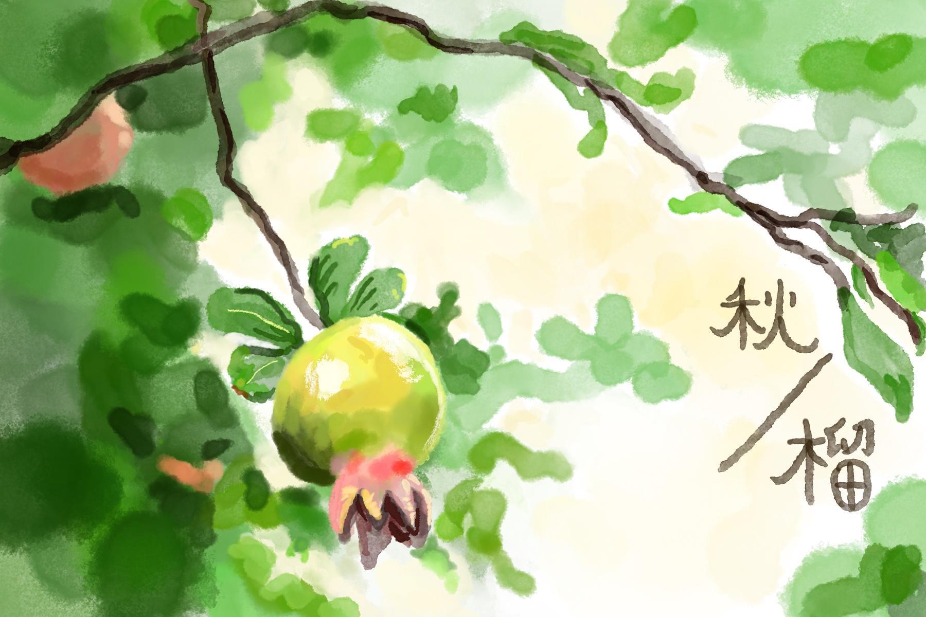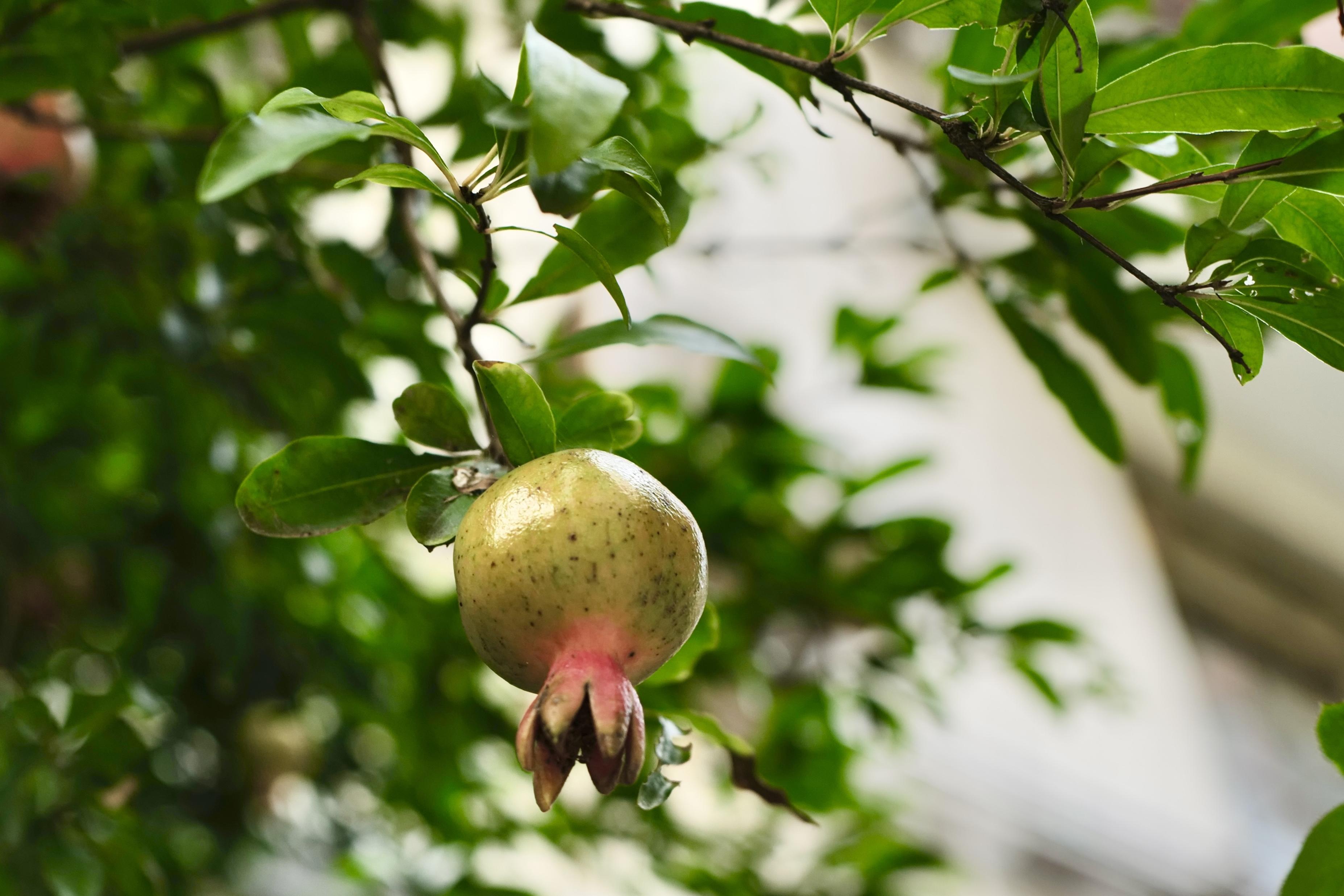 某家院子门口的石榴树开得正当时,树上结满的颗颗石榴喜庆圆满。
