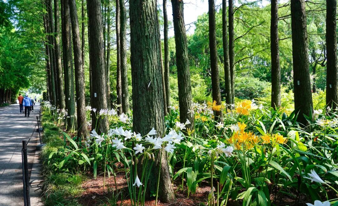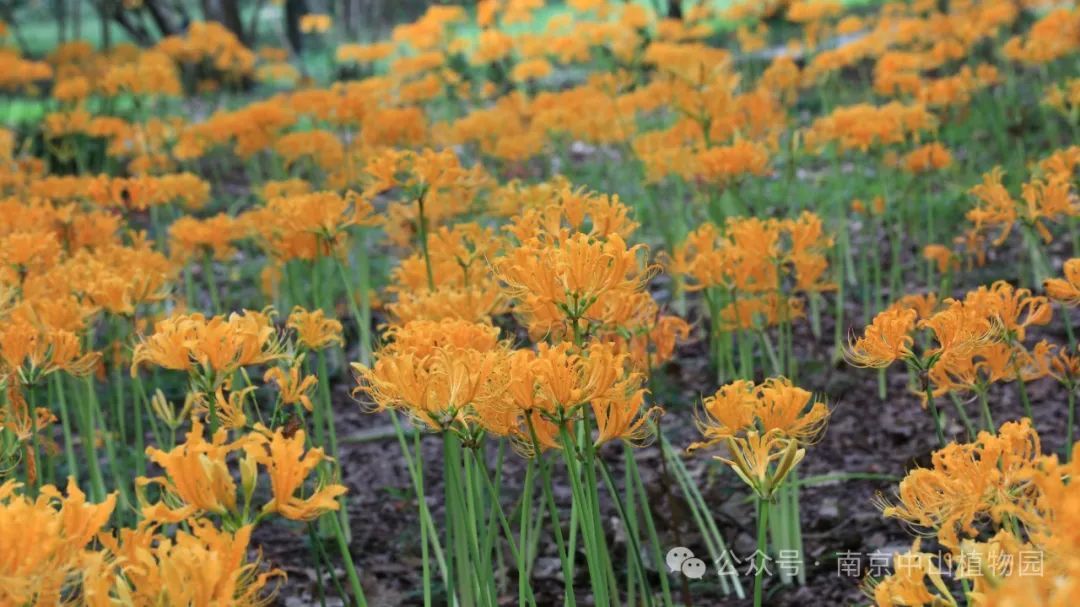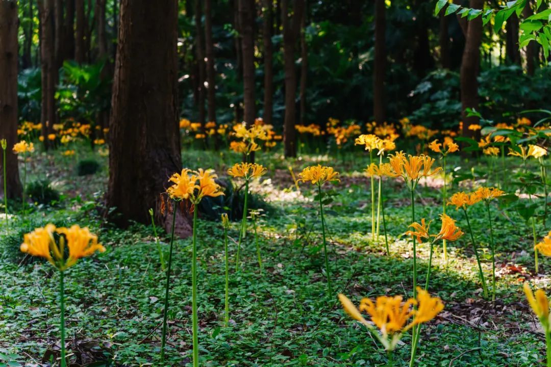 作为华东地区最大的植物园之一,中山植物园内石蒜花种类繁多,色彩斑斓。园内大片忽地笑盛开,形成了浪漫的黄色花海,漫步其间,每一步都仿佛踏入了画卷之中,让人心旷神怡。