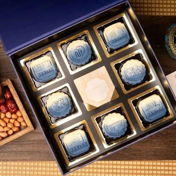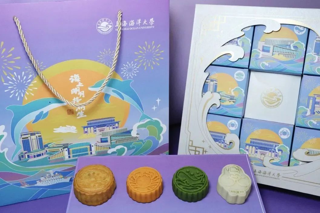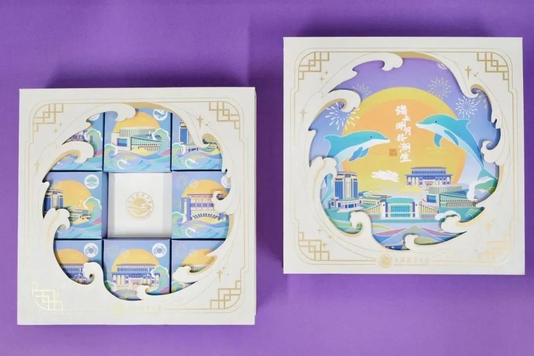 海大此次以海洋特色和校园建筑为主要设计元素制成中秋月饼包装,寓以“探索海大灿烂星辰,共享中秋团圆之时”之意。
