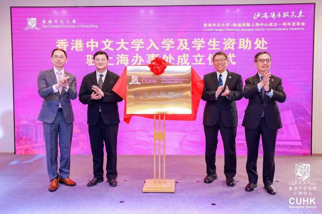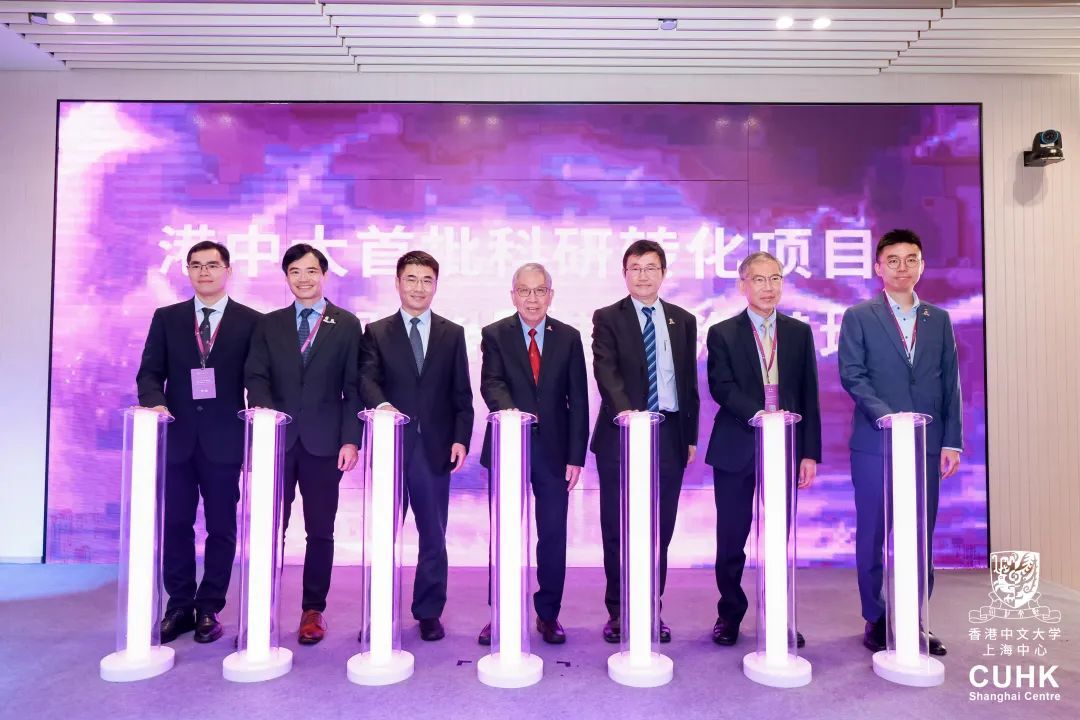与会领导共同为港中大入学及学生资助处驻上海办事处揭牌,并见证港中大首批五个科研转化落地项目正式入驻港中大创博港上海基地。