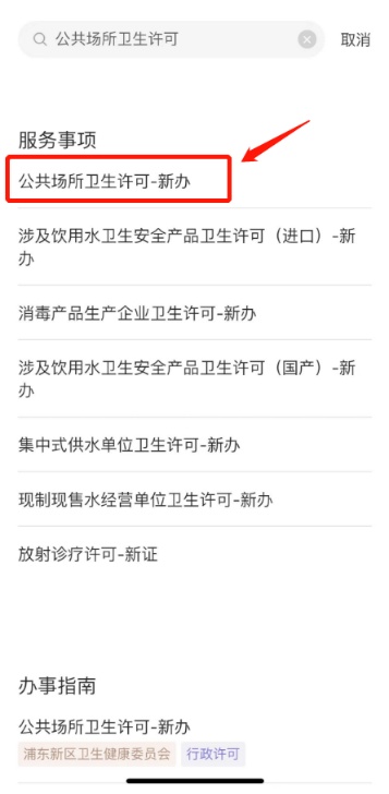 第一步:打开“随申办企业云”APP,搜索“公共场所卫生许可”选择“公共场所卫生许可-新办”,进入服务事项。