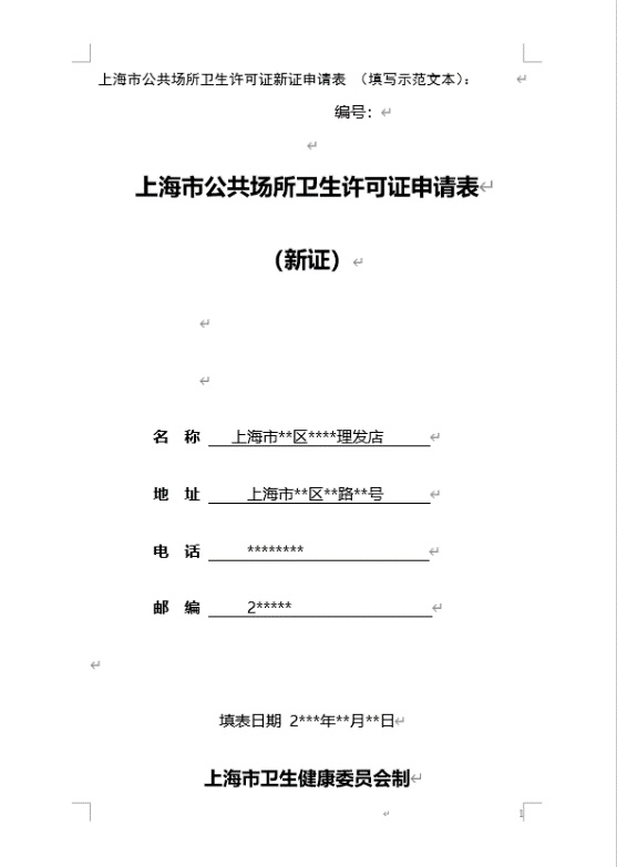 1.《上海市公共场所卫生许可证申请表(新证)》