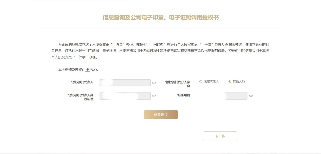 阅读办理须知,完成代办人授权,点击“下一步”。