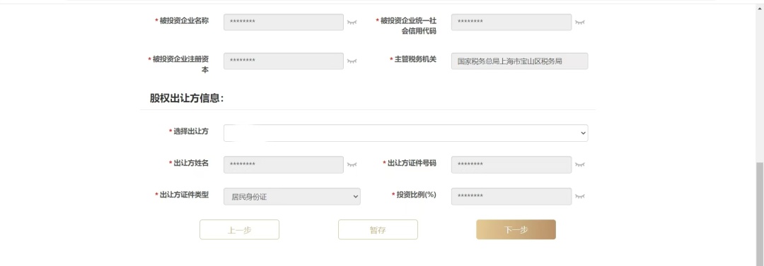 阅读“提示”,核实出让方与投资企业信息、转让方与受让方信息,核实无误点击“下一步”。