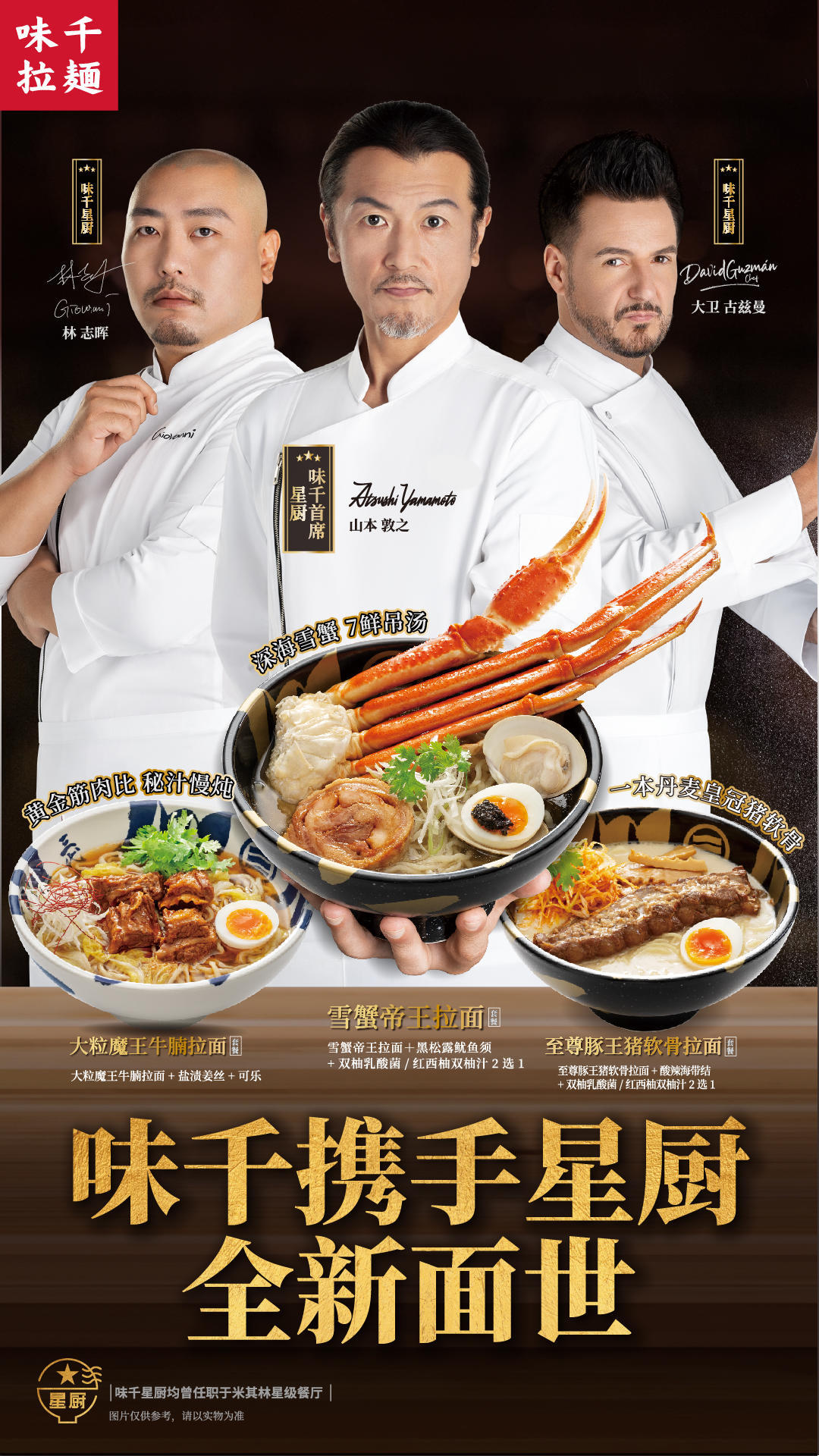 对于一家餐饮企业而言,产品是其品牌的灵魂所在。此次,味千拉面与日本“米其林”一星拉面店“金色不如归”主理人山本敦之,以及大卫·古兹曼和林志晖三位星厨强强联手,共同推出了雪蟹帝王拉面、至尊豚王猪软骨拉面、大粒魔王牛腩拉面三款星厨拉面套餐。