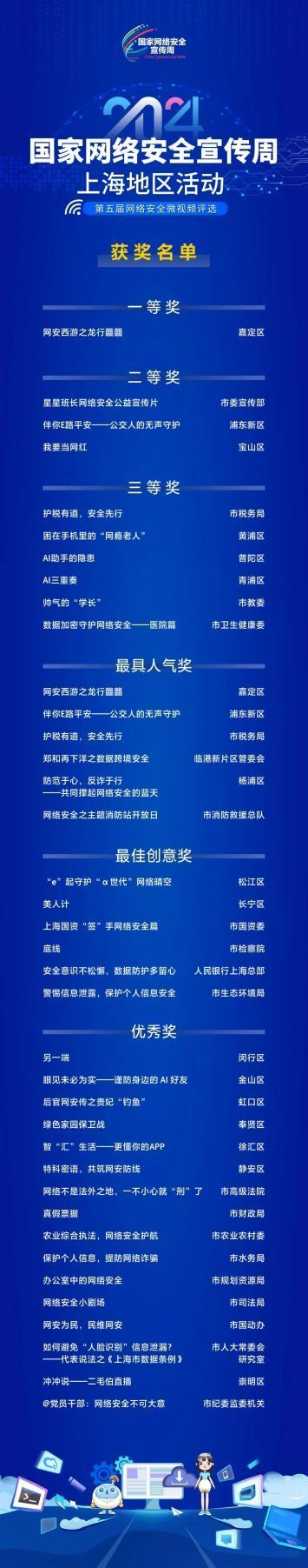 此外,为办好2024年国家网络安全宣传周上海地区活动,进一步提升广大人民群众网络安全意识,普及网络安全知识,上海市委网信办组织开展了“网络安全微视频”征集评选活动,共收到各区、各单位选送的微视频35部。