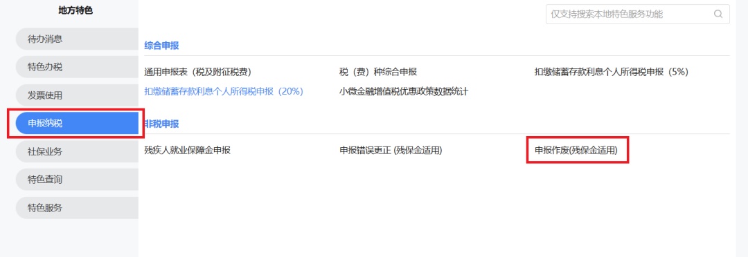 点击【地方特色】-【申报纳税】-【申报作废(残保金适用)】。