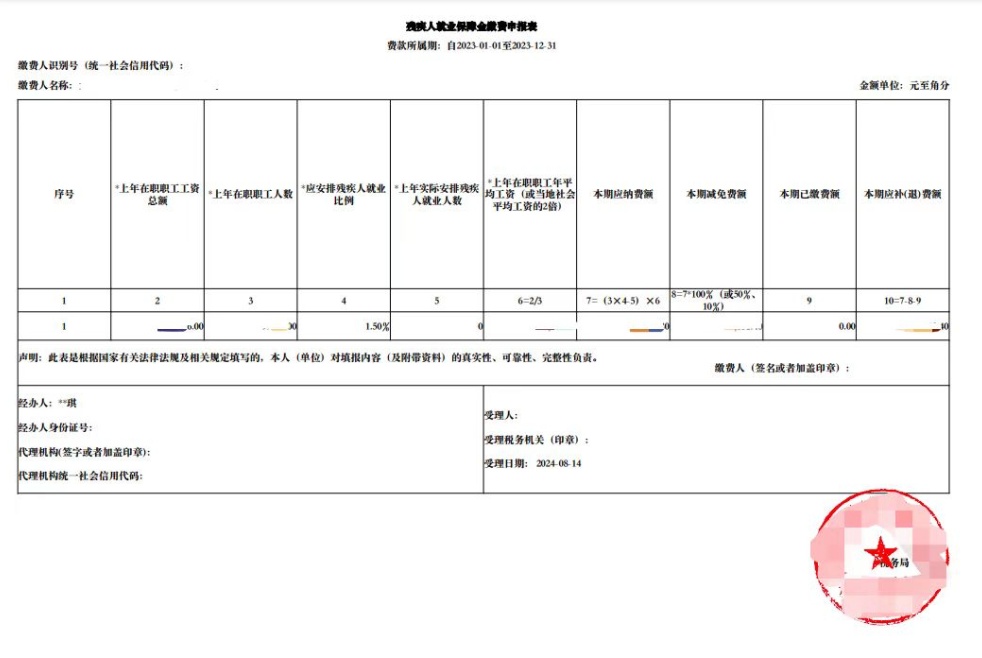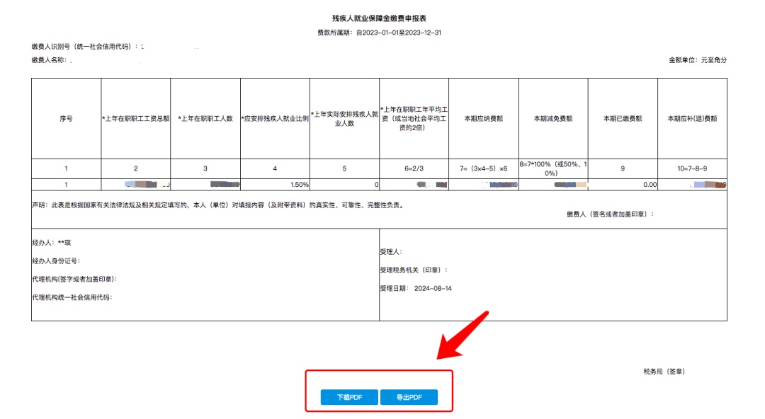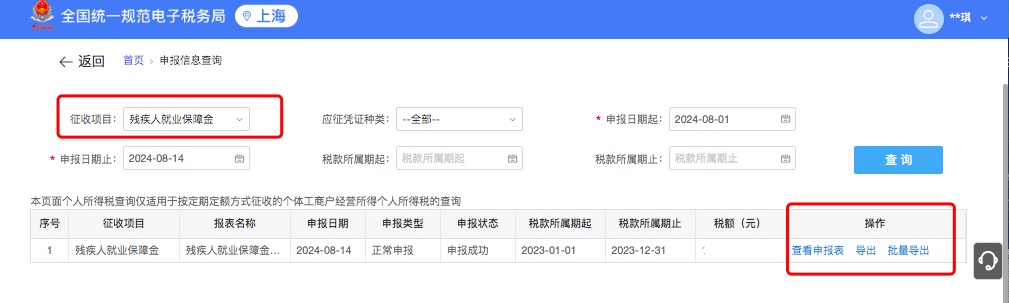 进入该页面后,选择征收项目“残疾人就业保障金”和申报日期,点击查询,即可查看申报表,下载或导出带有加盖税务机关受理章的申报表。