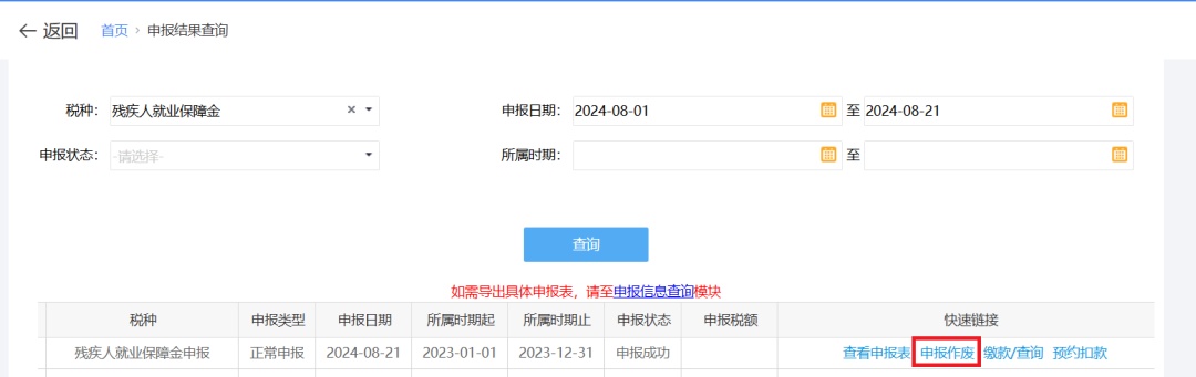 进入【申报作废(残保金适用)】页面后,选择税种“残疾人就业保障金”和申报日期,点击查询,点击【申报作废】完成相关业务。