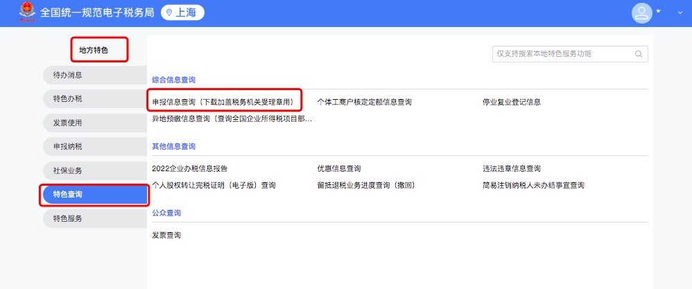 点击【地方特色】-【特色查询】-【申报信息查询(下载加盖税务机关受理章用)】。