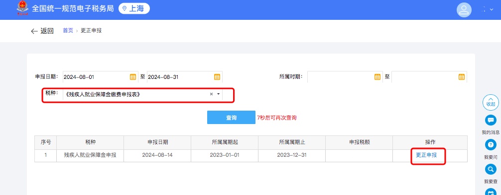 进入【申报错误更正(残保金适用)】页面后,选择税种“残疾人就业保障金缴费申报表”和申报日期,点击查询,点击【更正申报】可进入后续业务场景。