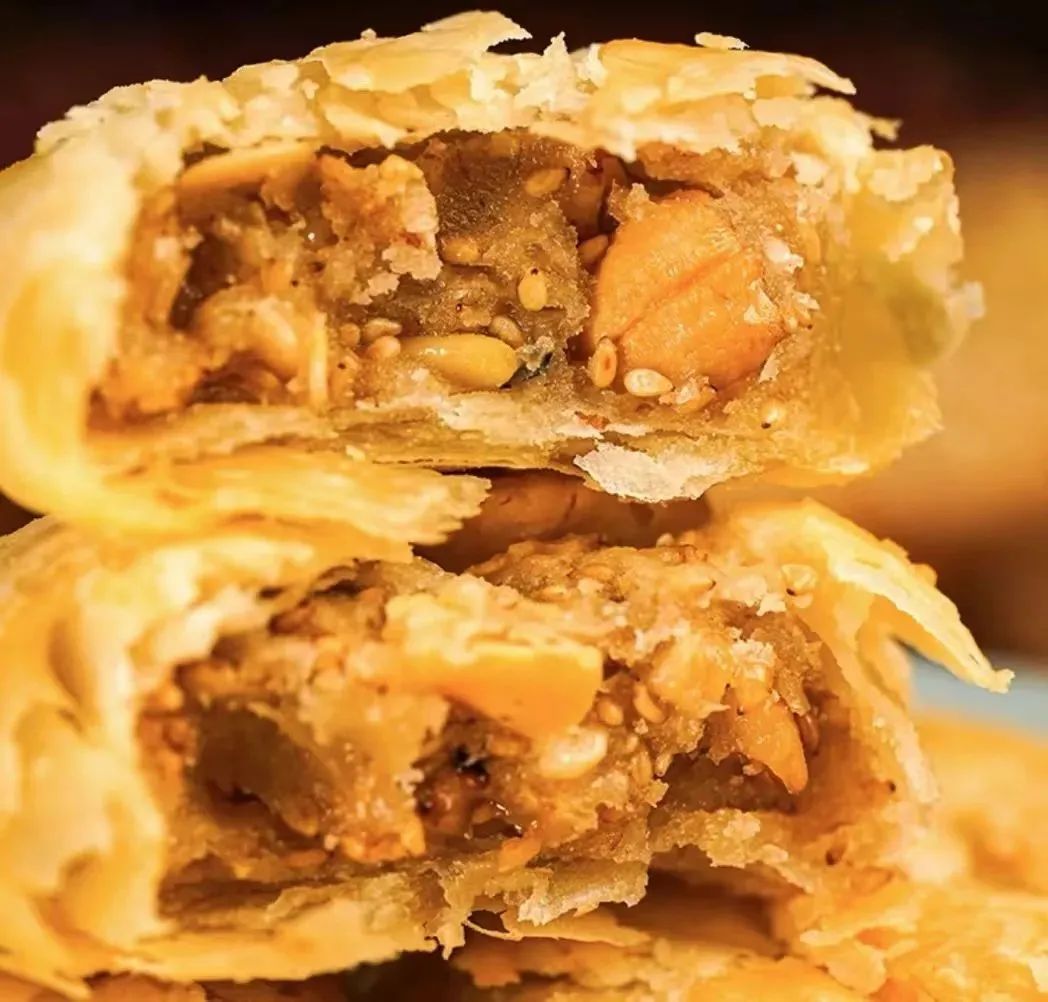 葱香牛肉月饼以牛霖肉为主,细嫩筋少,馅心里加入适量葱油,吃时能感受到牛肉独特的口感以及扑鼻的葱油香气。果仁玫瑰月饼的用料则更为丰富:云南玫瑰酱、冬瓜糖、瓜子仁、葡萄干、核桃仁、金桔、松子仁……近十种配料让月饼不仅香气四溢,还能吃到金桔、葡萄干的酸甜果味。