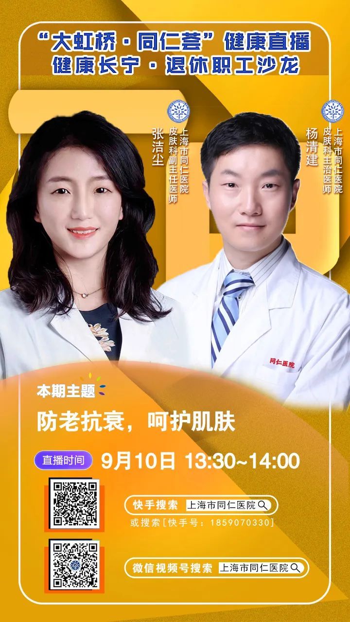 如何呵护肌肤才能延缓衰老?今天(9月10日)13:30—14:00,“上海长宁”APP将与上海市同仁医院“大虹桥·同仁荟健康直播”共同直播:防老抗衰,呵护肌肤。