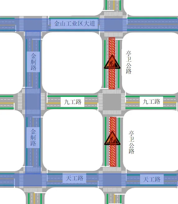 亭卫公路(天工路——金山工业区大道)道路施工,影响双向一根机动车道,途经该路段的车辆可从金山工业区大道、金舸路、天工路绕道通行。