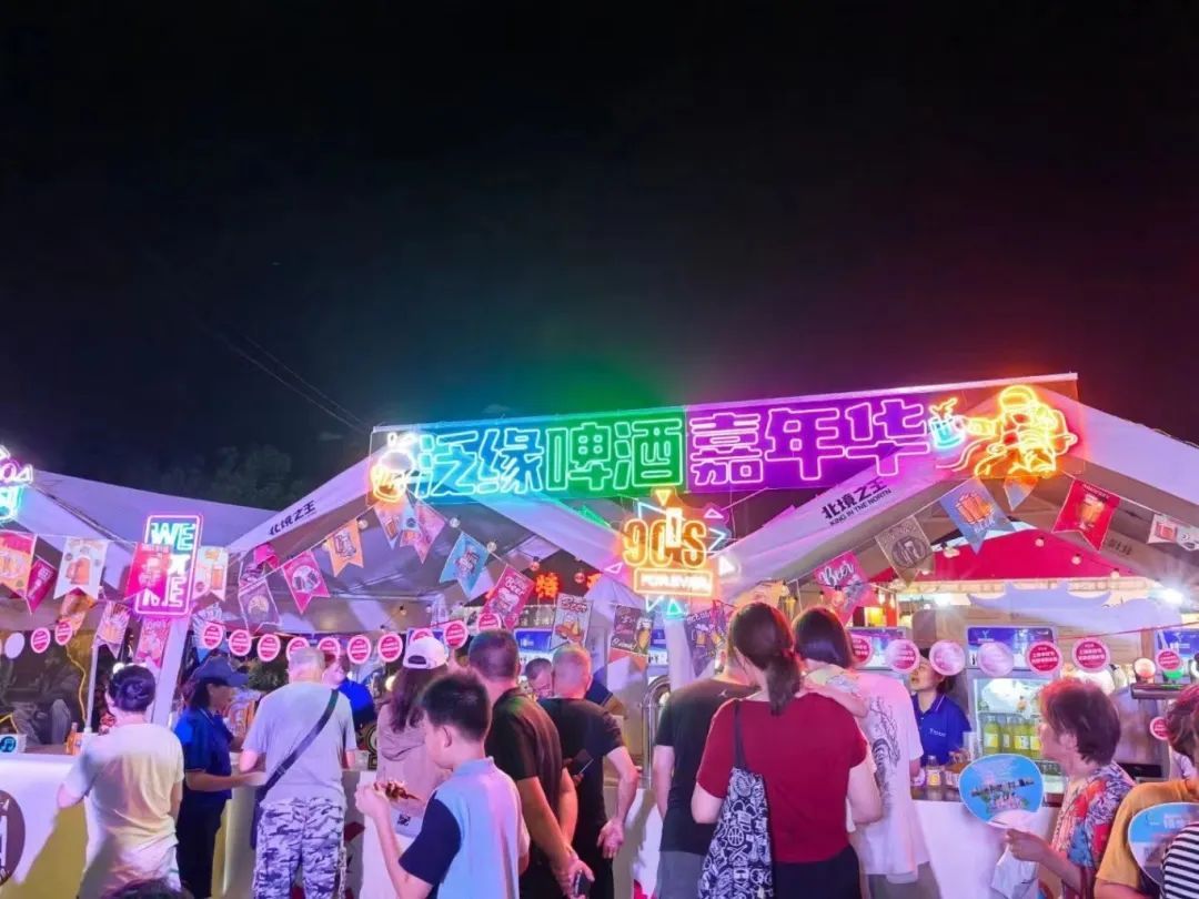 活动中央大草坪张灯结彩,音乐声、欢笑声和商家的吆喝声此起彼伏,空气中还洋溢着啤酒、烤串、烘烤鲜肉月饼的香味……为这凉爽的秋夜点上了一把消费的热火。