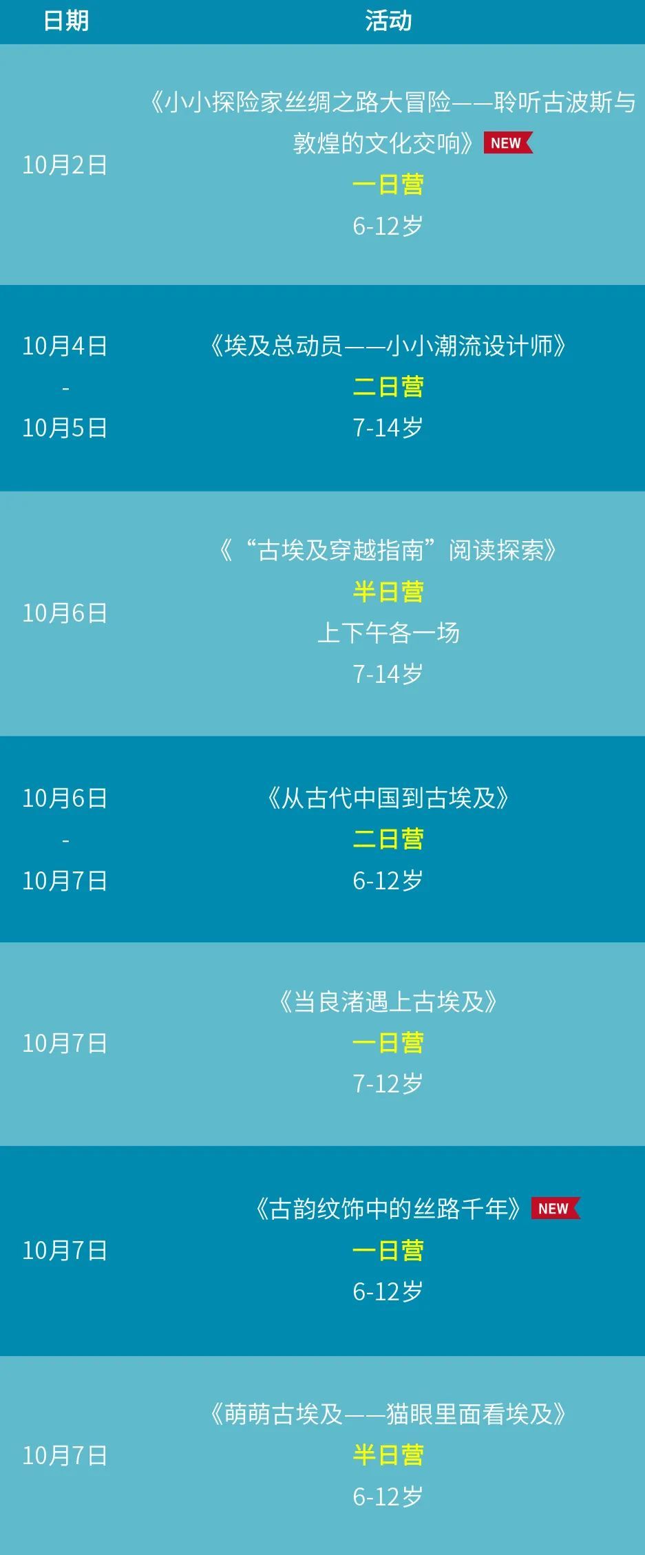 本次二日营活动,将串联上博常设展以及埃及特展等几大展厅,带领孩子们对比两大文明的历史发展、器物工艺、图案寓意、生活娱乐、生活信仰,以及背后的世界观、价值观,让你全方位看透本次古埃及大展。