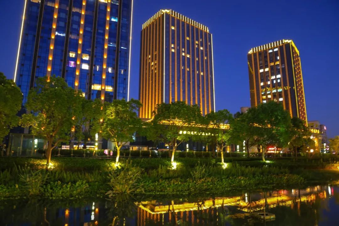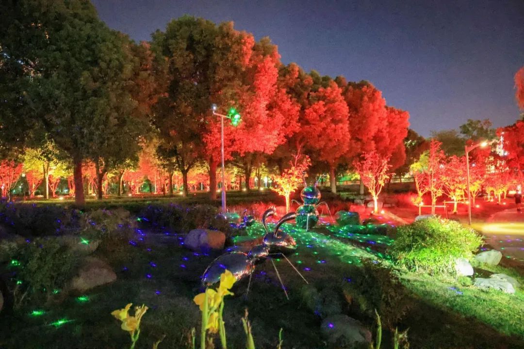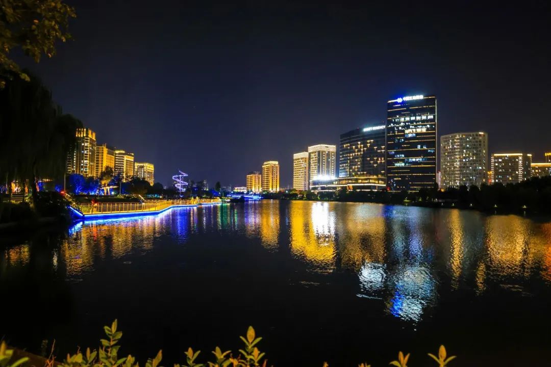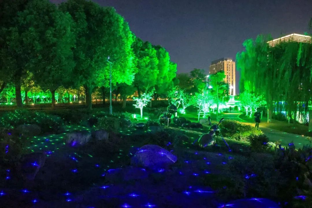 夜晚的五龙湖公园,灯光闪烁