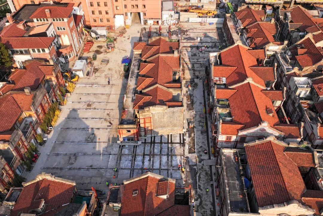 在历史建筑原位保留保护的前提下,张园保护性综合开发项目采用原位基础托换、建筑移位等低扰动、低影响技术,最大程度地保护风貌肌理,开创成片历史风貌保护区修缮和地下空间更新规模之最,与周边的在建、改建项目的地下室连通,借用车库出入口,解决了由于风貌保护无法设置地下车库出入口的难题,缓解历史风貌区及周边停车难问题。