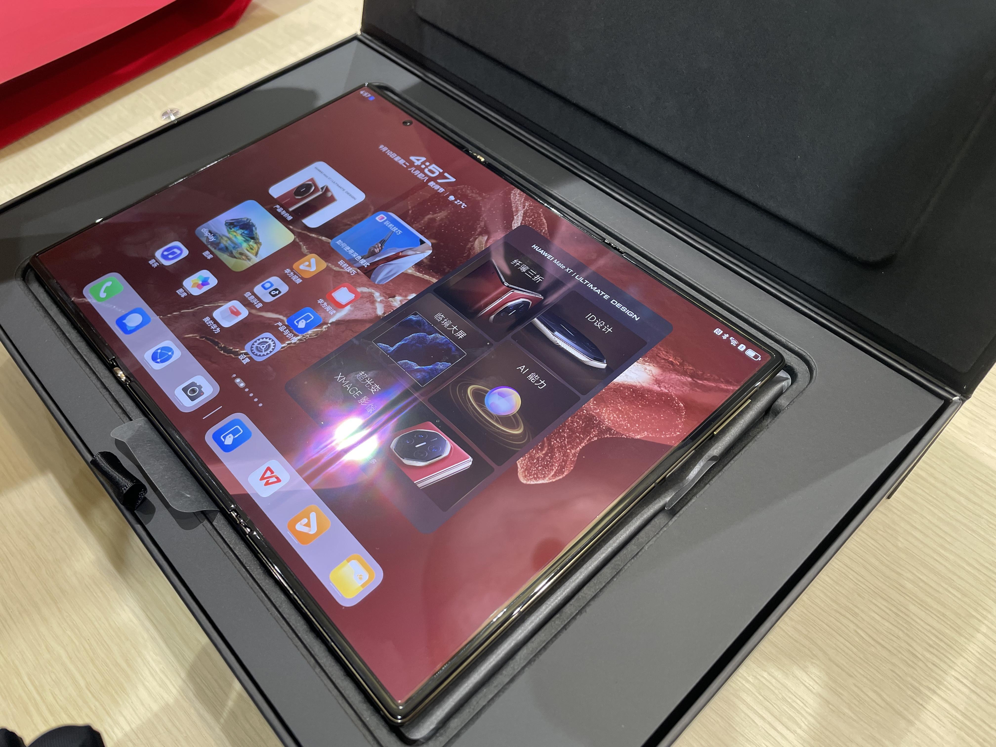 此次HUAWEI Mate XT 非凡大师共有红金和黑金两个配色,记者拿到的这台手机配色为发布会主推的红金配色,打开红黑色包装盒,里面共分两层,上层为主机,下层则为配件。此次配件准备了二套充电装置,分别用于车充和家用充电,此外还配备了无线耳机和手机壳。从外观来看,新手机传承了非凡大师系列的八角星钻设计,中轴对称,和谐有序;并创新使用正弦切面设计,形成立体光轨的视觉效果。切面之上,臻美岩脉纹理跃然其表,历经22天精工细作、78道繁复精密的工序,手工匠造,每一片岩脉纹理都独一无二。而HUAWEI Mate XT 非凡大师之所以受关注就是因为被不少人戏称为“翻奏章”的三折屏设计。这个设计是噱头还是真有用处?在工作人员的指导下,记者尝试了从单屏到双屏到三屏的翻折,通过华为首创天工铰链系统实现内外弯折,整个过程体验下来非常丝滑。而屏幕面积增加,的确也让浏览社交软件,观看视频以及查看WORD等文档有了新的感官体验,特别是当你查看表格时,可以做到“一目十行”,非常方便,满足了消费者生活、工作等各种场景下的需求。“我就是冲着这三折叠的设计来的,一开始主要是外观设计吸引我,但使用下来发现,大屏带来的感受的确很有意思,我工作经常要处理各种文档比如WORD、PDF或者PPT等,大屏浏览方便很多。”“手机设计很惊艳,不过价格也同样惊艳到我了,不过想一想,一台手机同时兼顾着一台平板的作用,这样算算也能接受。”首批体验者和记者聊道。