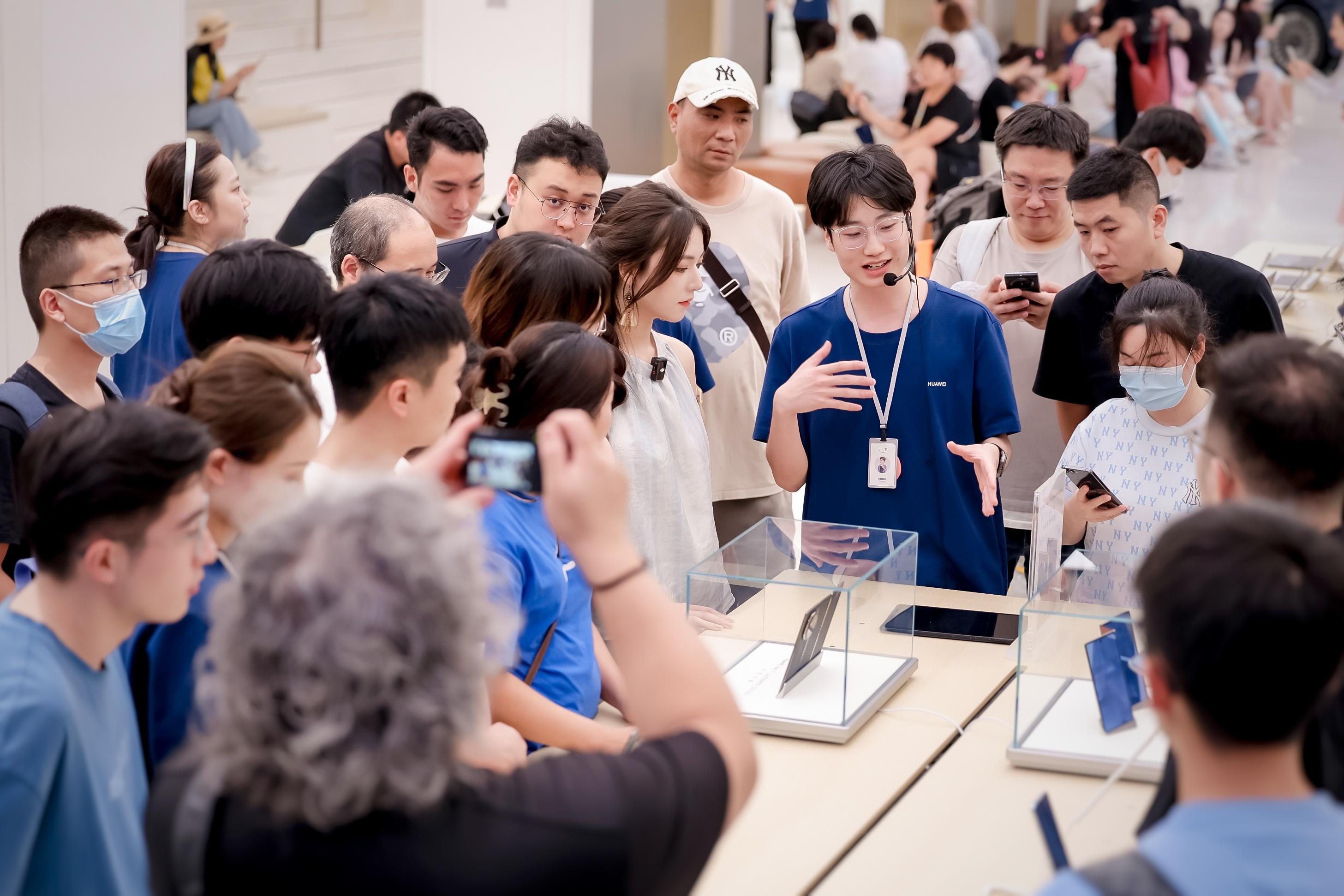 9月10日下午,全球首个商用三折叠屏手机HUAWEI Mate XT 非凡大师正式发布。手机还未正式上市时,就吸引了众多市民好奇的目光,自9月7日12时08分开始预约起,截止到9月10日晚,线上预约人数已达459万左右。9月10日下午,记者来到华为旗舰店·上海南京东路,已经有不少慕名而来的市民排起了长队,为的就是想在第一时间一睹真机风采。在工作人员的配合下,我们第一时间见到了这台华为史上最贵手机的庐山真面目,并进行了沉浸式开箱。