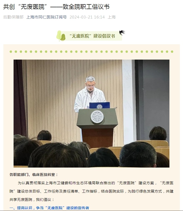院党委高度重视,把创建“无废医院”列入医院年度重点工作。院长马骏任组长,副院长杨军任副组长,后勤具体负责评审迎检工作,制定《上海市医院“无废医院”创建工作实施方案》,发放“无废医院”创建倡议书,科室主任依据方案和责任分工清单,定人、定责、定标准、定时限,做到“事有人干、责有人负”。
