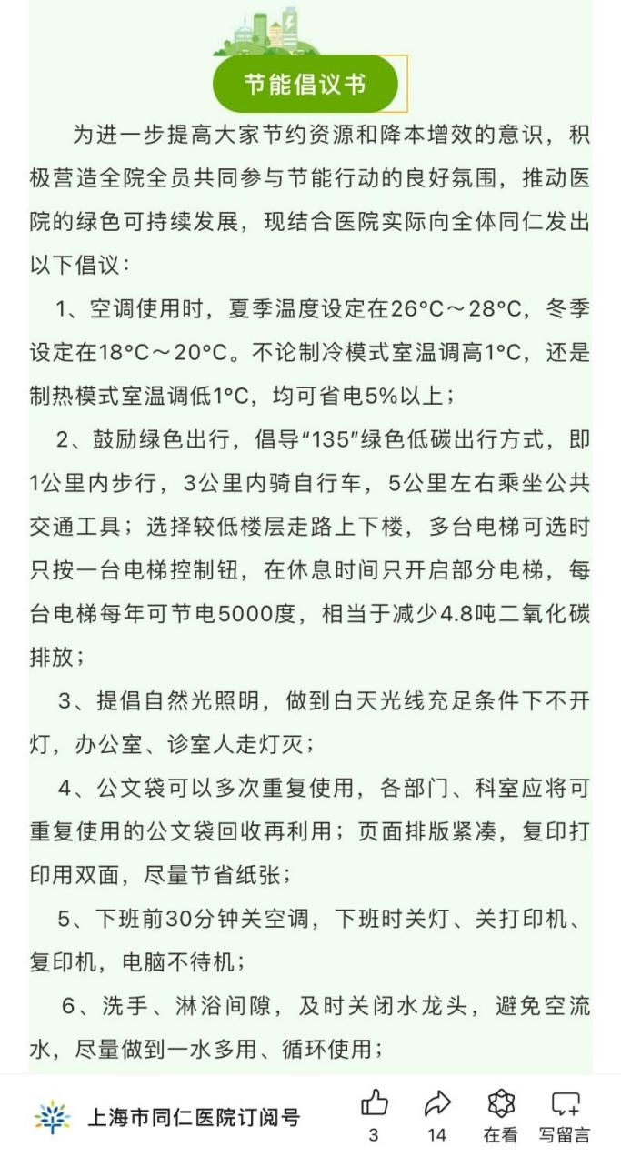 举措七 推行135绿色出行方式(1公里以内步行、3公里以内骑自行车、5公里以内乘坐公共交通工具),开展每周少开一天车,低碳出行等活动。各科室夏天空调温度不低于26℃,冬天温度不高于20摄氏度,人走灯灭,提倡节约用水用电。