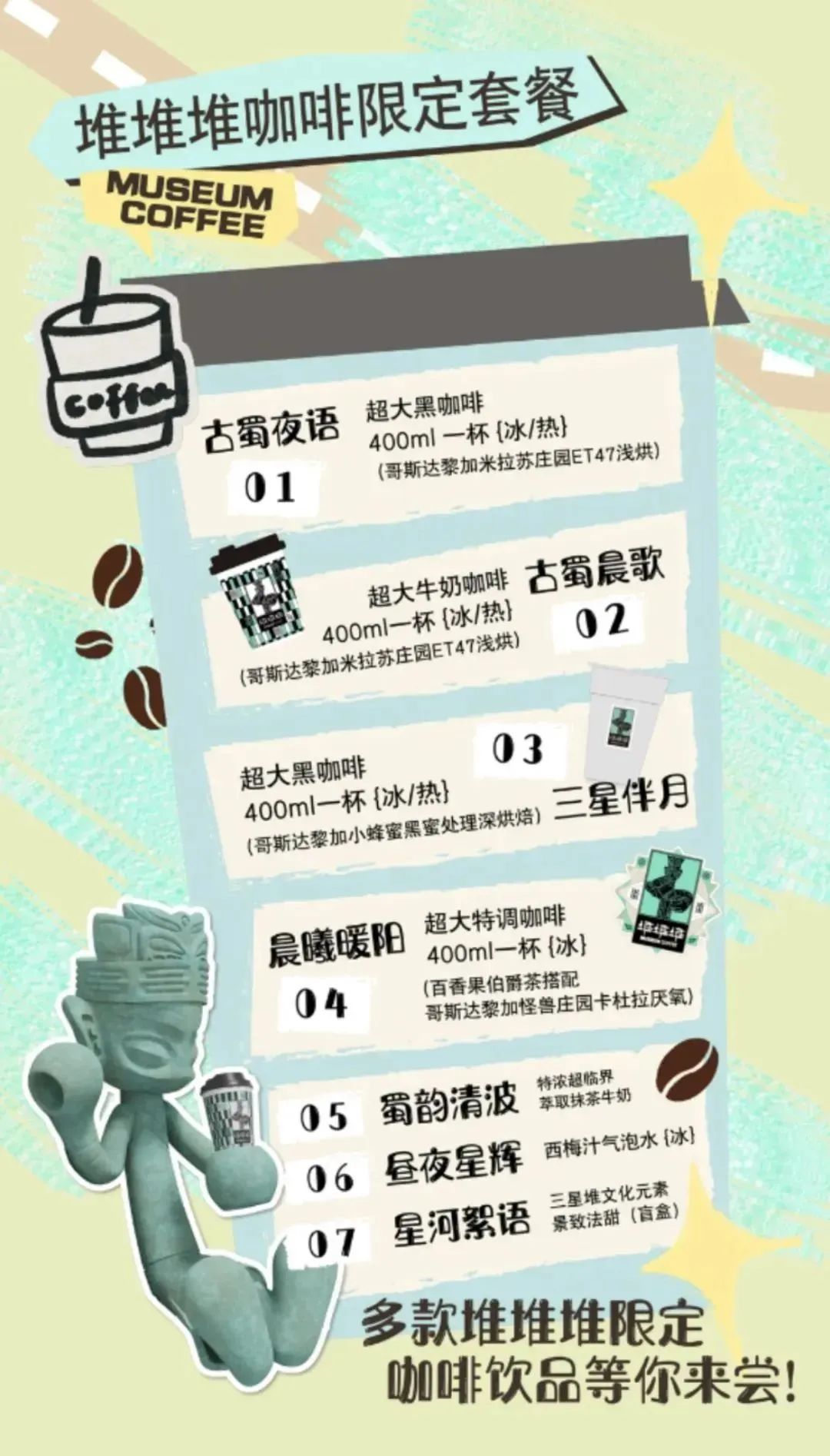 在堆堆堆咖啡快闪店,不仅可以畅快地买买买和集章打卡,还能够惬意地品尝“古蜀晨歌”“晨曦暖阳”“三星伴月”等多款结合了三星堆元素的限定特调饮品。在这里,咖啡师精心调制出的每一杯香醇咖啡,仿佛都与古蜀文明发生着奇妙的化学反应。