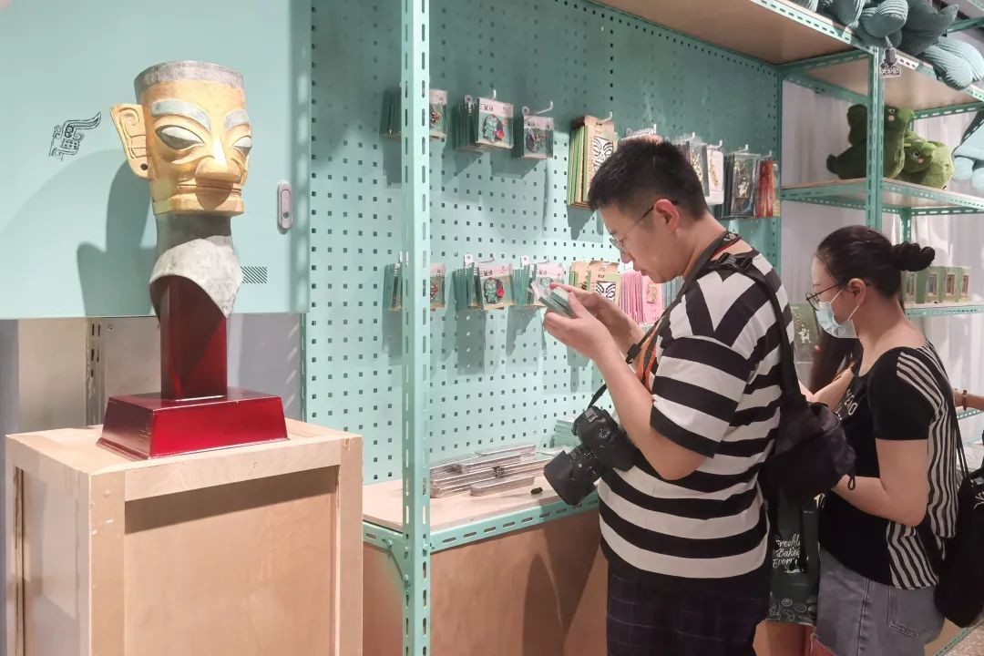 冰箱贴、书签、收纳包、T恤等多款以青铜大立人像为原型,全新设计的“大立人来了”系列文创产品将古老文明与现代都市生活巧妙结合,营造出摩登又充满趣味的文创体验氛围。