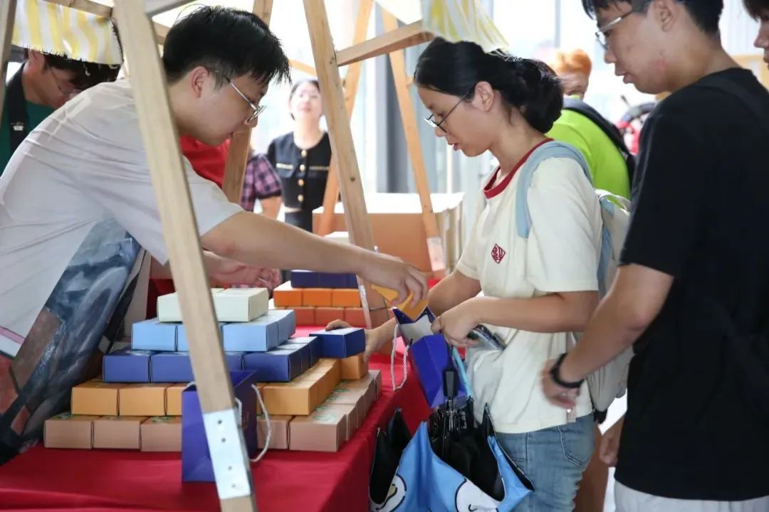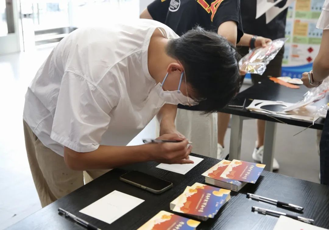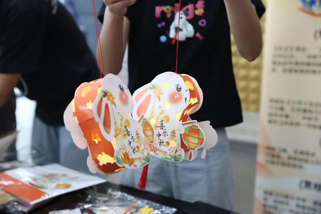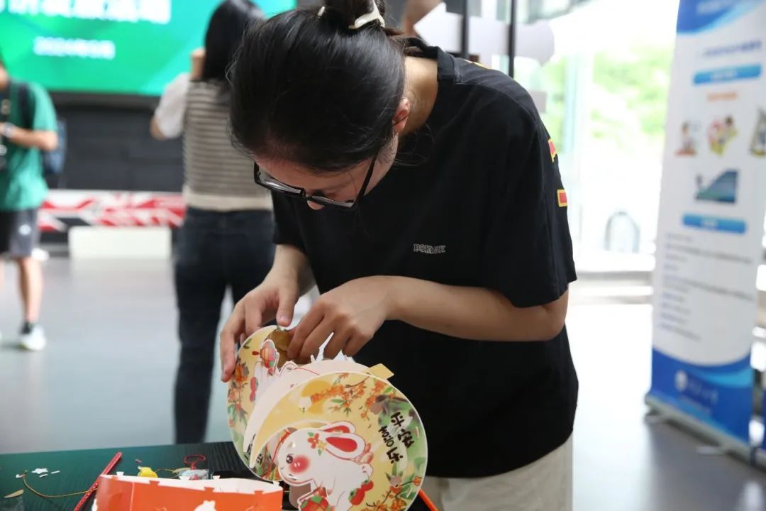 除了派送月饼外,不同学院还组织开展了形式多样的传统习俗活动。在材料科学与工程学院,不少学生聚集在大厅底楼的摊位前,或在明信片上写下祝福与展望,或动手制作兔子灯笼,提前感受中秋氛围。