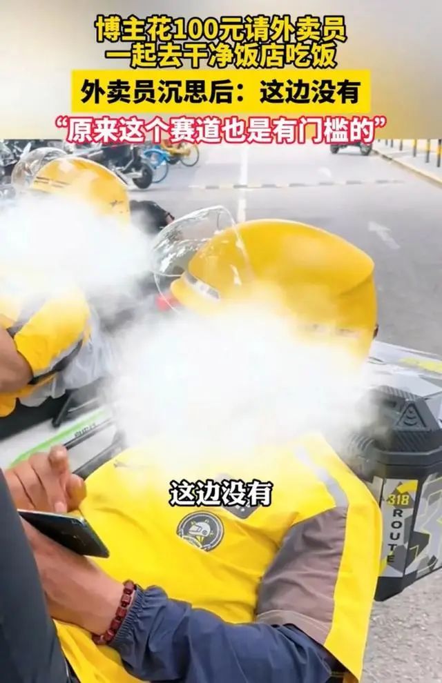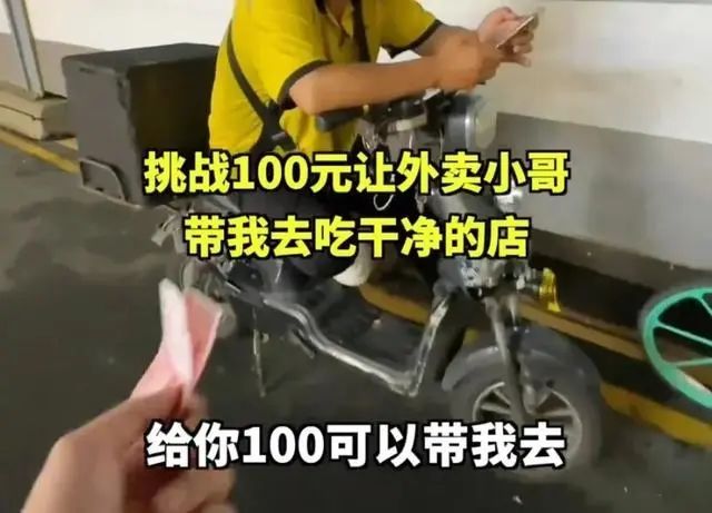 视频里,博主随机找到一位外卖小哥,给他100块钱,让他带自己去一家他觉得很干净的小店吃饭,“吃什么都行,味道是其次,就是一定得干净。”