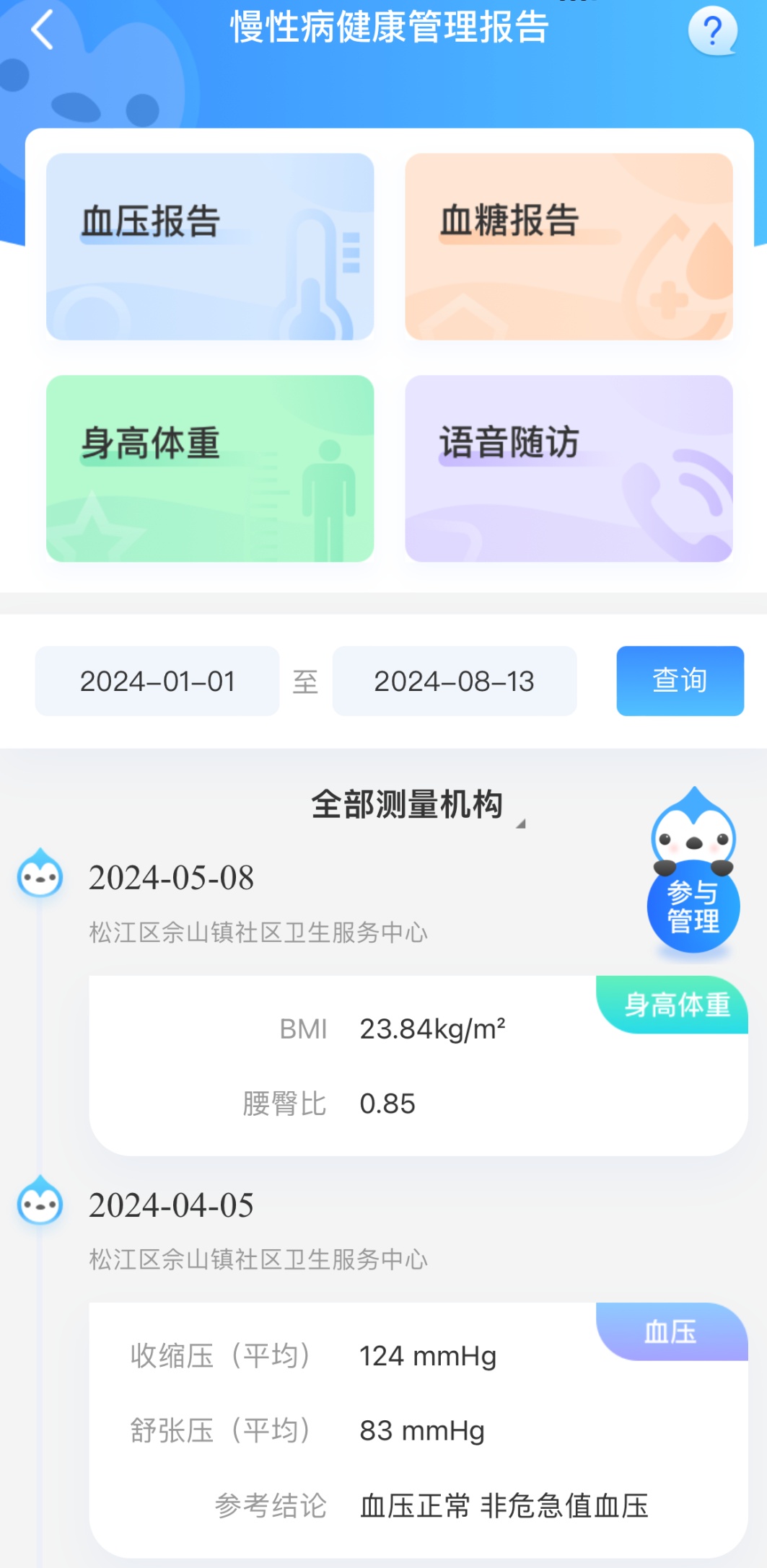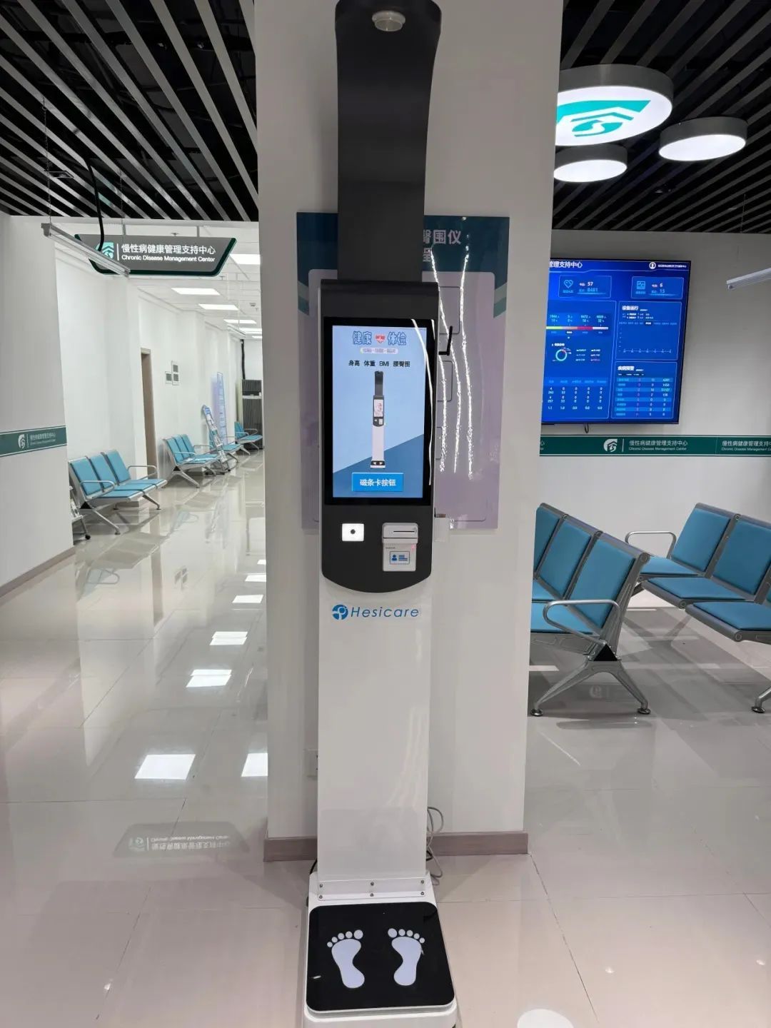 居民可以使用医保卡或身份证完成各项精准测量,当日测量的数据都会在慢病支持中心大屏上实时更新,最近一次的血压、血糖、身高、体重、腰臀围、大肠癌筛查等测量结果可上传到慢病信息系统。