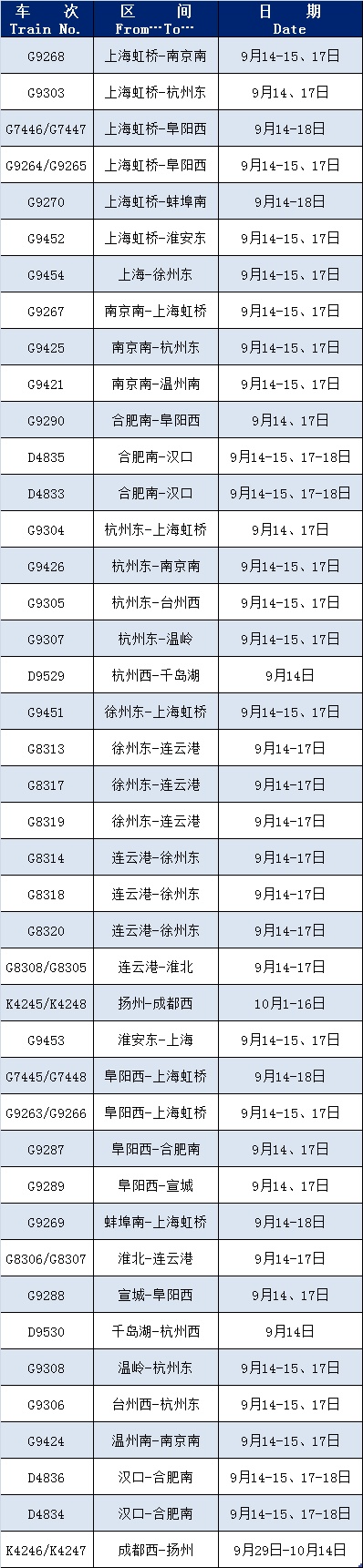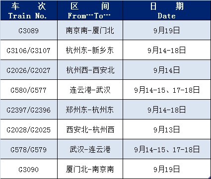 为满足旅客出行需求,近期增开G9268(上海虹桥—南京南)、G9303(上海虹桥—杭州东)等车次,恢复开行G3089(南京南—厦门北)、G3106/7(杭州东—新乡东)等车次。