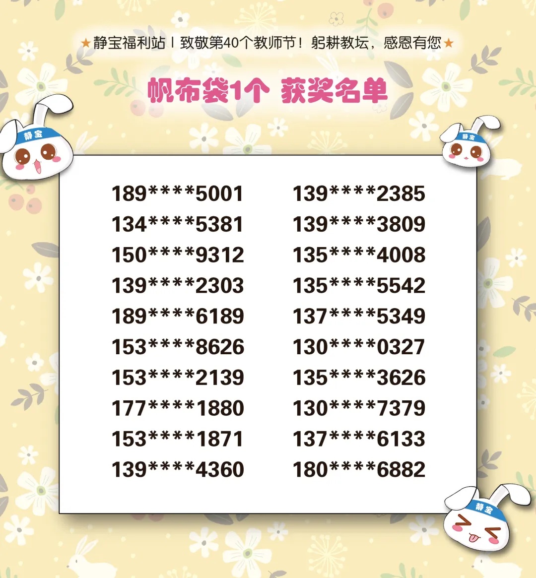 此前静宝推送的《静宝福利站|致敬第40个教师节!躬耕教坛,感恩有您》中奖名单已经出炉!详见↓