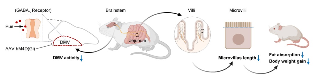 (脑干部位的迷走神经运动背核(DMV)可以长程支配空肠微绒毛(microvilli)的长度;当通过中药单体葛根素(Pue)或化学遗传(hM4D(Gi))抑制DMV神经元后,小肠绒毛长度变短,油脂吸收能力减少,实现减肥效果。)