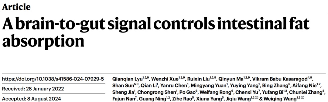 2024年9月11日,上海交通大学医学院附属瑞金医院王卫庆、王计秋团队在Nature杂志发表了文章A brain-to-gut signal controls intestinal fat absorption,揭开了这个“脑肠轴”之间的秘密,并找到了来自中药的“减肥神器”——葛根素。