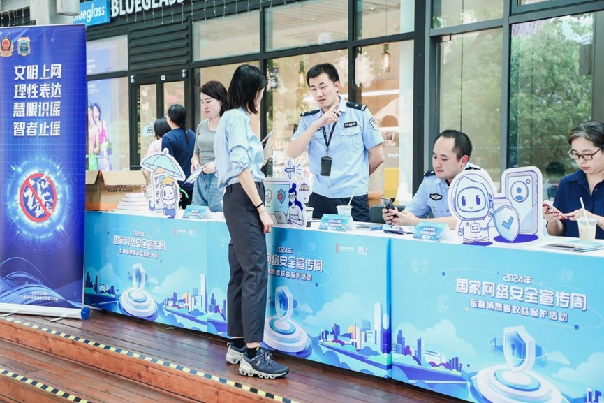 活动现场设置了公益法律咨询区域,由浦东新区互联网信息办公室、上海市公安局浦东分局网安支队的民警同志和大成律师事务所的专业律师亲临现场,派发《网络安全防范宣传手册》和《金融消费者的八项基本权利》等资料的同时,为前来咨询学习的白领和市民讲解网络安全问题相关知识,旨在全方位提升市民的网络安全意识与金融消费者权益保护知识。