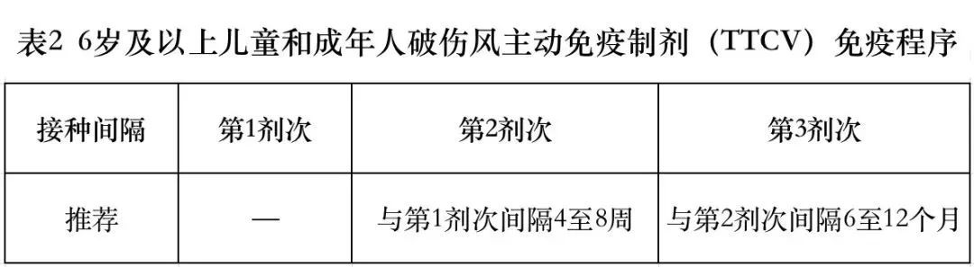 6岁及以上儿童和成年人的TTCV免疫程序可按照表2及相关疫苗说明书规范接种。不满6岁的婴幼儿及儿童应按照国家免疫规划疫苗儿童免疫程序进行TTCV接种。