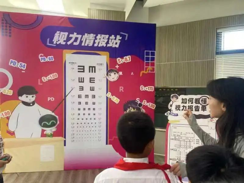 在“视力情报站”展位布置大型视力表,孩子们通过现场自测,学习视力报告单中远视储备、近视度数等关键项目的意义,掌握“每学期最少进行一次视力检测”的基本要求。
